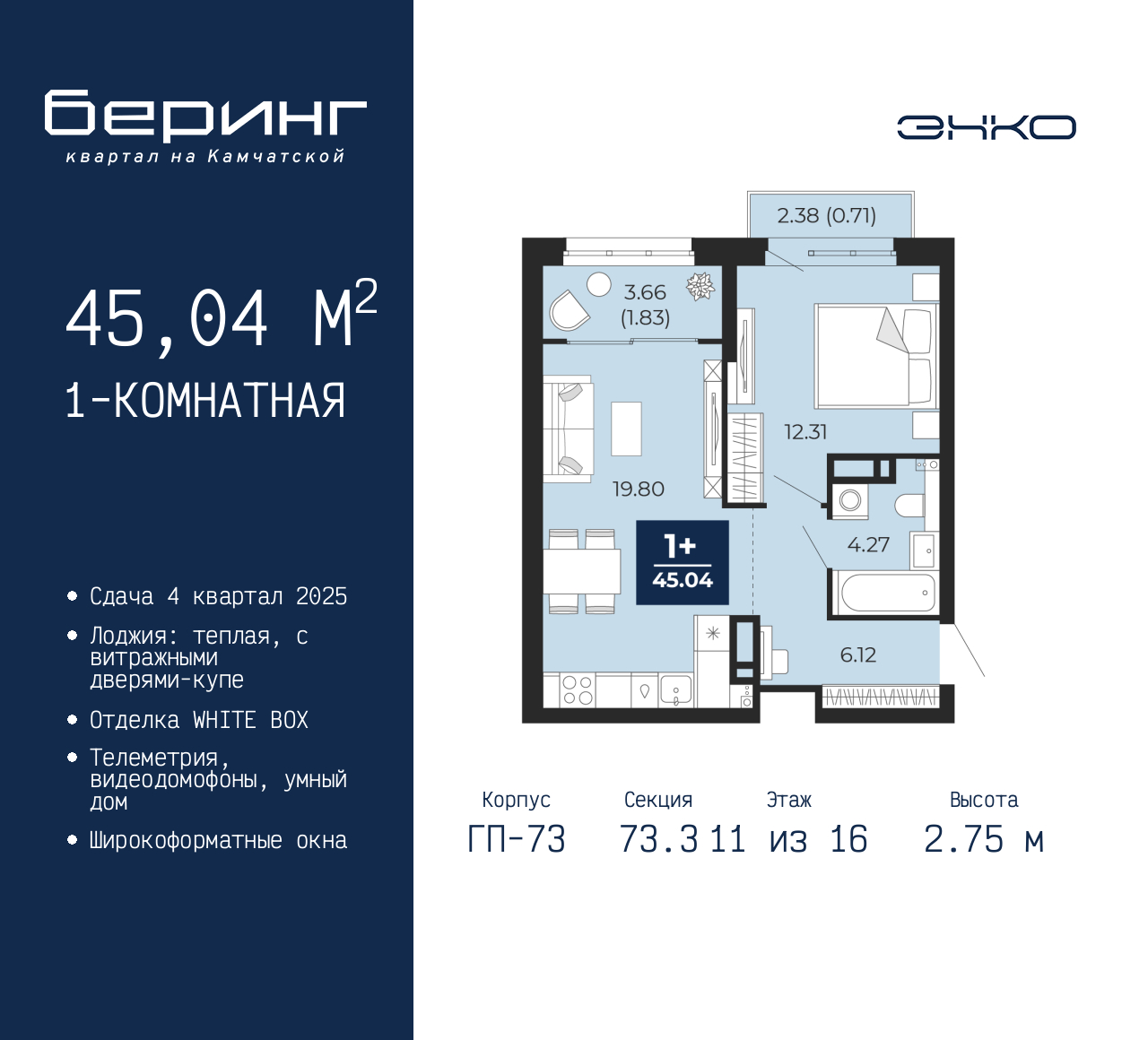 Просторная 1-комн. квартира в ЖК "Беринг" на 11 этаже. Квартира без отделки, новый собственник может сделать ремонт по своему дизайн-проекту. Общая площадь: 45.04 кв.м., жилая: 12.31 кв.м., площадь просторной кухни-столовой: 19.8 кв.м. Все окна выходят на одну сторону. В квартире один балкон и одна лоджия, один совмещенный санузел. Высота потолков 2.75 м. Дом монолитный, многоподъездный, переменной этажности, от 9 до 22 этажей. Квартира находится в 73.3-й секции высотой 16 этажей в корпусе ГП-73. На этаже 8 квартир. В подъезде 1 пассажирский и 1 грузовой лифт. Окончание строительства - 4 квартал 2025 года. Оформление сделки по договору долевого участия. Подобно знаменитому исследователю, мы чувствуем себя первооткрывателями этой локации. Хотим показать новую суть места, сформировать для вас жизненный опыт, которого ещё не было. Беринг — район зелёного цвета. Беринг — район, который откроется вам с другой стороны. Впечатлит новым уровнем комфорта и качеством жизни. Беринг — открытие на карте города. Первый квартал расположен в районе Тура, в границах улиц: Камчатская – Западносибирская – Энтузиастов. Вокруг уже есть всё для того, чтобы ежедневная рутина была лишь частью жизни и не доставляла дискомфорта. Школы и детские сады, магазины и аптеки, поликлиника, места для семейного отдыха, пеших и велопрогулок, и даже рыбалки. Масштабное озеленение дворов — визитная карточка ЭНКО и ваш оазис спокойствия, чтобы отвлечься от повседневности. Раскидистые деревья, кустарники, травы и цветы — осталось остановиться, вдохнуть и расслабиться, глядя на эту природную красоту. Стилистика подъездов продолжает концепцию Беринга, вдохновлённого Камчаткой: сдержанный, но при этом впечатляющий дизайн соседствует с удобством и функциональностью. (AQID02528158)