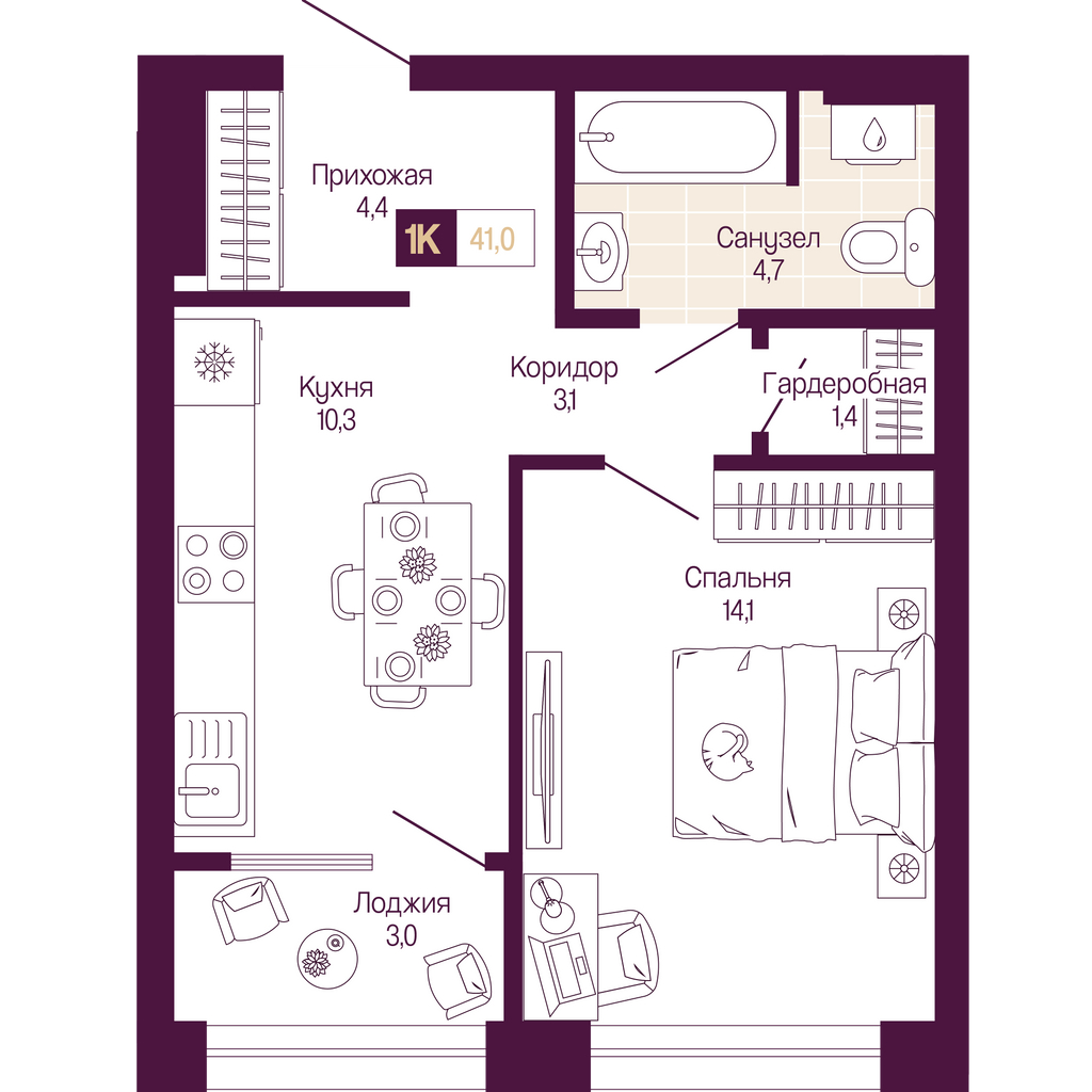 - Жилая площадь 14.1 м²
