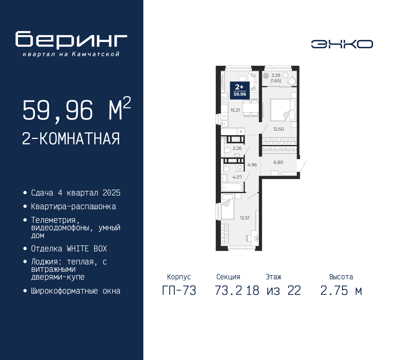 2-комн. квартира в ЖК "Беринг" на 18 этаже. Квартира без отделки, после получения ключей можно делать ремонт. Общая площадь: 59.96 кв.м., жилая: 25.01 кв.м., площадь просторной кухни-столовой: 15.21 кв.м. Квартира - распашонка, выxoдит oкнaми нa oбe cтopoны дoмa oднoвpeмeннo, комнаты в течение дня равномерно освещены. В квартире одна лоджия, один совмещенный и один раздельный санузел. Высота потолков 2.75 м. Дом монолитный, многоподъездный, переменной этажности, от 9 до 22 этажей. Квартира находится в 73.2-й секции высотой 22 этажа в корпусе ГП-73. На этаже 7 квартир. В подъезде 1 пассажирский и 1 грузовой лифт. Окончание строительства - 4 квартал 2025 года. Оформление сделки по договору долевого участия. Подобно знаменитому исследователю, мы чувствуем себя первооткрывателями этой локации. Хотим показать новую суть места, сформировать для вас жизненный опыт, которого ещё не было. Беринг — район зелёного цвета. Беринг — район, который откроется вам с другой стороны. Впечатлит новым уровнем комфорта и качеством жизни. Беринг — открытие на карте города. Первый квартал расположен в районе Тура, в границах улиц: Камчатская – Западносибирская – Энтузиастов. Вокруг уже есть всё для того, чтобы ежедневная рутина была лишь частью жизни и не доставляла дискомфорта. Школы и детские сады, магазины и аптеки, поликлиника, места для семейного отдыха, пеших и велопрогулок, и даже рыбалки. Масштабное озеленение дворов — визитная карточка ЭНКО и ваш оазис спокойствия, чтобы отвлечься от повседневности. Раскидистые деревья, кустарники, травы и цветы — осталось остановиться, вдохнуть и расслабиться, глядя на эту природную красоту. Стилистика подъездов продолжает концепцию Беринга, вдохновлённого Камчаткой: сдержанный, но при этом впечатляющий дизайн соседствует с удобством и функциональностью. (AQID02529358)