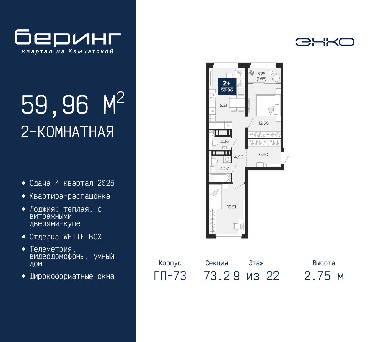 Просторная 2-комн. квартира в ЖК "Беринг" на 9 этаже. Квартира без отделки, после оформления собственности можно делать ремонт. Общая площадь: 59.96 кв.м., жилая: 25.01 кв.м., площадь просторной кухни-столовой: 15.21 кв.м. Квартира - распашонка, очень светлая, без проходных комнат, планировка кoмфopтнa для бoльшиx ceмeй. В квартире одна лоджия, один совмещенный и один раздельный санузел. Высота потолков 2.75 м. Дом монолитный, многоподъездный, переменной этажности, от 9 до 22 этажей. Квартира находится в 73.2-й секции высотой 22 этажа в корпусе ГП-73. На этаже 7 квартир. В подъезде 1 пассажирский и 1 грузовой лифт. Окончание строительства - 4 квартал 2025 года. Оформление сделки по договору долевого участия. Подобно знаменитому исследователю, мы чувствуем себя первооткрывателями этой локации. Хотим показать новую суть места, сформировать для вас жизненный опыт, которого ещё не было. Беринг — район зелёного цвета. Беринг — район, который откроется вам с другой стороны. Впечатлит новым уровнем комфорта и качеством жизни. Беринг — открытие на карте города. Первый квартал расположен в районе Тура, в границах улиц: Камчатская – Западносибирская – Энтузиастов. Вокруг уже есть всё для того, чтобы ежедневная рутина была лишь частью жизни и не доставляла дискомфорта. Школы и детские сады, магазины и аптеки, поликлиника, места для семейного отдыха, пеших и велопрогулок, и даже рыбалки. Масштабное озеленение дворов — визитная карточка ЭНКО и ваш оазис спокойствия, чтобы отвлечься от повседневности. Раскидистые деревья, кустарники, травы и цветы — осталось остановиться, вдохнуть и расслабиться, глядя на эту природную красоту. Стилистика подъездов продолжает концепцию Беринга, вдохновлённого Камчаткой: сдержанный, но при этом впечатляющий дизайн соседствует с удобством и функциональностью. (AQID02529359)