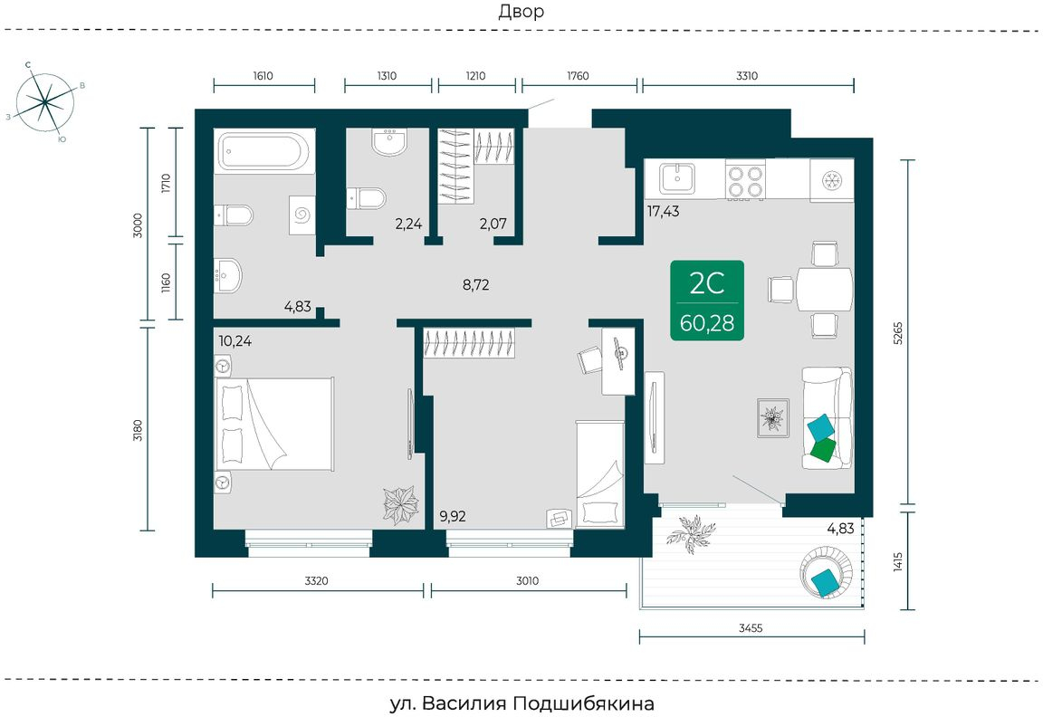 - Общая площадь 60.28 м²