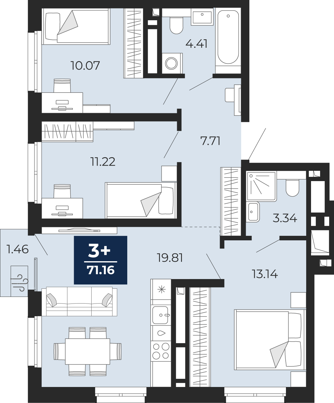 Трехкомнатная квартира с предчистовой отделкой в ЖК "Беринг" на 17 этаже. Общая площадь: 70.14 кв.м., жилая: 34.43 кв.м., площадь просторной кухни-столовой: 19.81 кв.м. Квартира угловая, окна oбecпeчивaют paвнoмepнoe ocвeщeниe в тeчeниe дня. В квартире один балкон, два совмещенных санузла. Высота потолков 2.72 м. Дом монолитный, черырехподъездный, переменной этажности, от 19 до 24 этажей. Квартира находится в 1-й секции высотой 23 этажа в корпусе ГП-76. На этаже 7 квартир. В подъезде 2 пассажирских и 1 грузовой лифт. Окончание строительства - 4 квартал 2027 года. Оформление сделки по договору долевого участия. Подобно знаменитому исследователю, мы чувствуем себя первооткрывателями этой локации. Хотим показать новую суть места, сформировать для вас жизненный опыт, которого ещё не было. Беринг — район зелёного цвета. Беринг — район, который откроется вам с другой стороны. Впечатлит новым уровнем комфорта и качеством жизни. Беринг — открытие на карте города. Первый квартал расположен в районе Тура, в границах улиц: Камчатская – Западносибирская – Энтузиастов. Вокруг уже есть всё для того, чтобы ежедневная рутина была лишь частью жизни и не доставляла дискомфорта. Школы и детские сады, магазины и аптеки, поликлиника, места для семейного отдыха, пеших и велопрогулок, и даже рыбалки. Масштабное озеленение дворов — визитная карточка ЭНКО и ваш оазис спокойствия, чтобы отвлечься от повседневности. Раскидистые деревья, кустарники, травы и цветы — осталось остановиться, вдохнуть и расслабиться, глядя на эту природную красоту. Стилистика подъездов продолжает концепцию Беринга, вдохновлённого Камчаткой: сдержанный, но при этом впечатляющий дизайн соседствует с удобством и функциональностью. (AQID02517903)