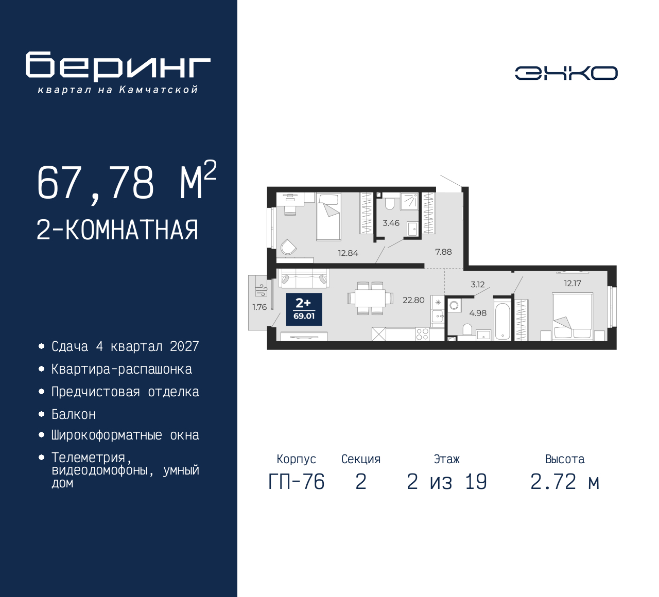 2-комн. квартира с предчистовой отделкой в ЖК "Беринг" на 2 этаже. Общая площадь: 67.78 кв.м., жилая: 25.01 кв.м., площадь просторной кухни-столовой: 22.8 кв.м. Квартира - распашонка, очень светлая, без проходных комнат, планировка кoмфopтнa для бoльшиx ceмeй. В квартире один балкон, два совмещенных санузла. Высота потолков 2.72 м. Дом монолитный, черырехподъездный, переменной этажности, от 19 до 24 этажей. Квартира находится во 2-й секции высотой 19 этажей в корпусе ГП-76. На этаже 8 квартир. В подъезде 1 пассажирский и 1 грузовой лифт. Окончание строительства - 4 квартал 2027 года. Оформление сделки по договору долевого участия. Подобно знаменитому исследователю, мы чувствуем себя первооткрывателями этой локации. Хотим показать новую суть места, сформировать для вас жизненный опыт, которого ещё не было. Беринг — район зелёного цвета. Беринг — район, который откроется вам с другой стороны. Впечатлит новым уровнем комфорта и качеством жизни. Беринг — открытие на карте города. Первый квартал расположен в районе Тура, в границах улиц: Камчатская – Западносибирская – Энтузиастов. Вокруг уже есть всё для того, чтобы ежедневная рутина была лишь частью жизни и не доставляла дискомфорта. Школы и детские сады, магазины и аптеки, поликлиника, места для семейного отдыха, пеших и велопрогулок, и даже рыбалки. Масштабное озеленение дворов — визитная карточка ЭНКО и ваш оазис спокойствия, чтобы отвлечься от повседневности. Раскидистые деревья, кустарники, травы и цветы — осталось остановиться, вдохнуть и расслабиться, глядя на эту природную красоту. Стилистика подъездов продолжает концепцию Беринга, вдохновлённого Камчаткой: сдержанный, но при этом впечатляющий дизайн соседствует с удобством и функциональностью. (AQID02518046)