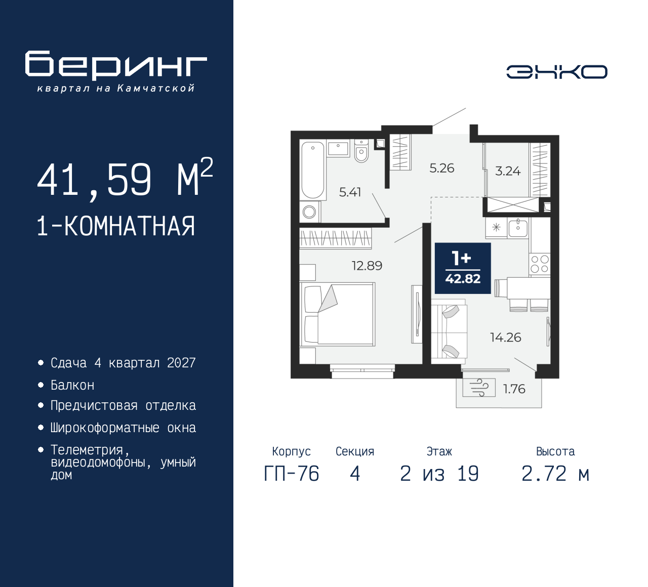 Просторная 1-комн. квартира с предчистовой отделкой в ЖК "Беринг" на 2 этаже. Общая площадь: 41.59 кв.м., жилая: 12.89 кв.м., площадь просторной кухни-столовой: 14.26 кв.м. Все окна выходят на одну сторону. В квартире один балкон, один совмещенный санузел. Высота потолков 2.72 м. Дом монолитный, черырехподъездный, переменной этажности, от 19 до 24 этажей. Квартира находится в 4-й секции высотой 19 этажей в корпусе ГП-76. На этаже 5 квартир. В подъезде 1 пассажирский и 1 грузовой лифт. Окончание строительства - 4 квартал 2027 года. Оформление сделки по договору долевого участия. Подобно знаменитому исследователю, мы чувствуем себя первооткрывателями этой локации. Хотим показать новую суть места, сформировать для вас жизненный опыт, которого ещё не было. Беринг — район зелёного цвета. Беринг — район, который откроется вам с другой стороны. Впечатлит новым уровнем комфорта и качеством жизни. Беринг — открытие на карте города. Первый квартал расположен в районе Тура, в границах улиц: Камчатская – Западносибирская – Энтузиастов. Вокруг уже есть всё для того, чтобы ежедневная рутина была лишь частью жизни и не доставляла дискомфорта. Школы и детские сады, магазины и аптеки, поликлиника, места для семейного отдыха, пеших и велопрогулок, и даже рыбалки. Масштабное озеленение дворов — визитная карточка ЭНКО и ваш оазис спокойствия, чтобы отвлечься от повседневности. Раскидистые деревья, кустарники, травы и цветы — осталось остановиться, вдохнуть и расслабиться, глядя на эту природную красоту. Стилистика подъездов продолжает концепцию Беринга, вдохновлённого Камчаткой: сдержанный, но при этом впечатляющий дизайн соседствует с удобством и функциональностью. (AQID02518335)
