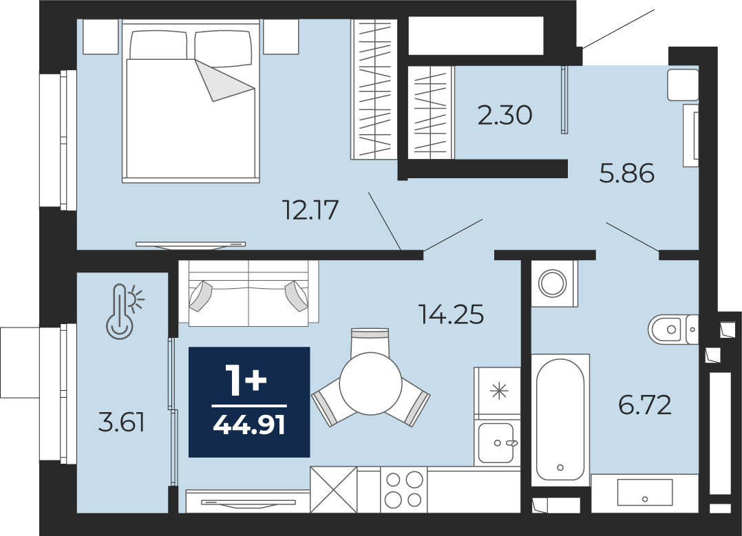 - Общая площадь 44.91 м²