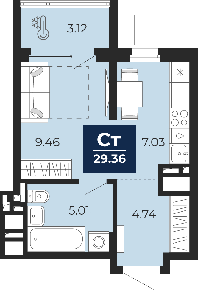 - Общая площадь 27.8 м²