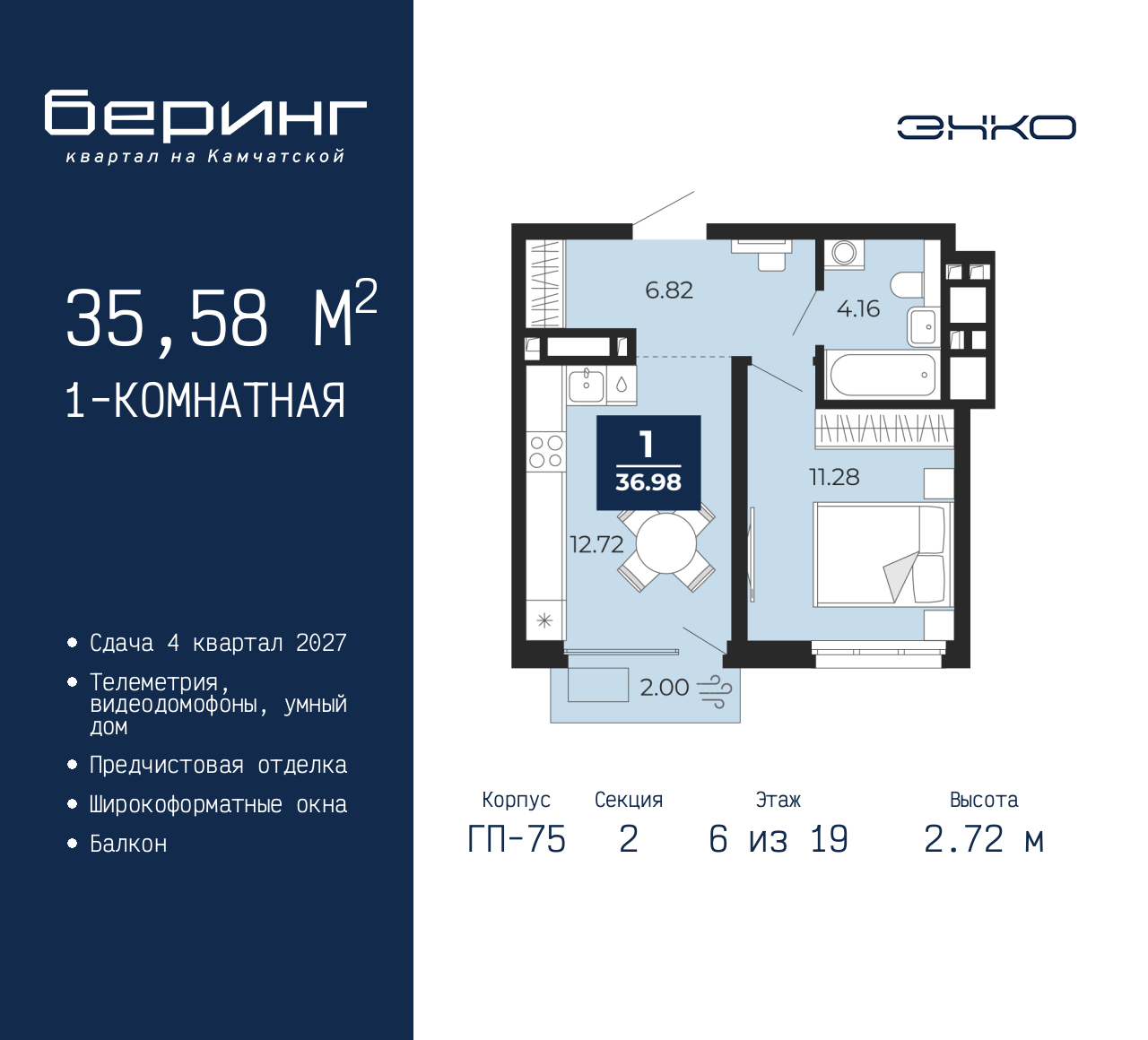 Просторная однокомнатная квартира с предчистовой отделкой в ЖК "Беринг" на 6 этаже. Общая площадь: 35.58 кв.м., жилая: 11.28 кв.м., площадь просторной кухни-столовой: 12.72 кв.м. Все окна выходят на одну сторону. В квартире один балкон, один совмещенный санузел. Высота потолков 2.72 м. Дом монолитный, многоподъездный, переменной этажности, от 17 до 24 этажей. Квартира находится во 2-й секции высотой 19 этажей в корпусе ГП-75. На этаже 7 квартир. В подъезде 2 пассажирских и 1 грузовой лифт. Окончание строительства - 4 квартал 2027 года. Оформление сделки по договору долевого участия. Подобно знаменитому исследователю, мы чувствуем себя первооткрывателями этой локации. Хотим показать новую суть места, сформировать для вас жизненный опыт, которого ещё не было. Беринг — район зелёного цвета. Беринг — район, который откроется вам с другой стороны. Впечатлит новым уровнем комфорта и качеством жизни. Беринг — открытие на карте города. Первый квартал расположен в районе Тура, в границах улиц: Камчатская – Западносибирская – Энтузиастов. Вокруг уже есть всё для того, чтобы ежедневная рутина была лишь частью жизни и не доставляла дискомфорта. Школы и детские сады, магазины и аптеки, поликлиника, места для семейного отдыха, пеших и велопрогулок, и даже рыбалки. Масштабное озеленение дворов — визитная карточка ЭНКО и ваш оазис спокойствия, чтобы отвлечься от повседневности. Раскидистые деревья, кустарники, травы и цветы — осталось остановиться, вдохнуть и расслабиться, глядя на эту природную красоту. Стилистика подъездов продолжает концепцию Беринга, вдохновлённого Камчаткой: сдержанный, но при этом впечатляющий дизайн соседствует с удобством и функциональностью. (AQID02529549)