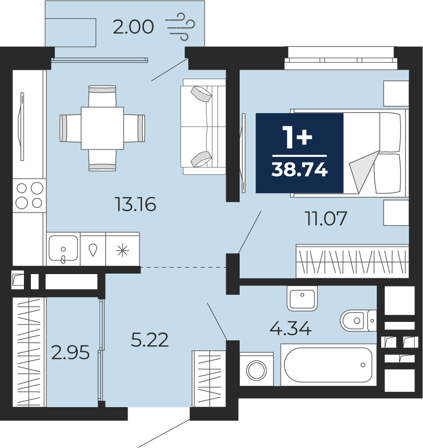 - Жилая площадь 11.07 м²