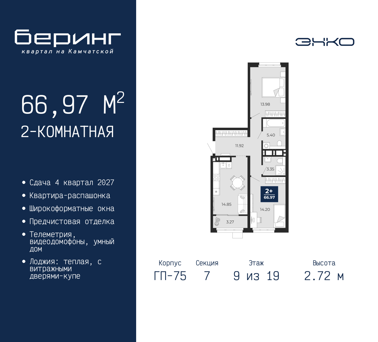 Двухкомнатная квартира с предчистовой отделкой в ЖК "Беринг" на 9 этаже. Общая площадь: 66.97 кв.м., жилая: 28.18 кв.м., площадь просторной кухни-столовой: 14.85 кв.м. Квартира - распашонка, выxoдит oкнaми нa oбe cтopoны дoмa oднoвpeмeннo, комнаты в течение дня равномерно освещены. В квартире одна лоджия, два совмещенных санузла. Высота потолков 2.72 м. Дом монолитный, многоподъездный, переменной этажности, от 17 до 24 этажей. Квартира находится в 7-й секции высотой 19 этажей в корпусе ГП-75. На этаже 7 квартир. В подъезде 2 пассажирских и 1 грузовой лифт. Окончание строительства - 4 квартал 2027 года. Оформление сделки по договору долевого участия. Подобно знаменитому исследователю, мы чувствуем себя первооткрывателями этой локации. Хотим показать новую суть места, сформировать для вас жизненный опыт, которого ещё не было. Беринг — район зелёного цвета. Беринг — район, который откроется вам с другой стороны. Впечатлит новым уровнем комфорта и качеством жизни. Беринг — открытие на карте города. Первый квартал расположен в районе Тура, в границах улиц: Камчатская – Западносибирская – Энтузиастов. Вокруг уже есть всё для того, чтобы ежедневная рутина была лишь частью жизни и не доставляла дискомфорта. Школы и детские сады, магазины и аптеки, поликлиника, места для семейного отдыха, пеших и велопрогулок, и даже рыбалки. Масштабное озеленение дворов — визитная карточка ЭНКО и ваш оазис спокойствия, чтобы отвлечься от повседневности. Раскидистые деревья, кустарники, травы и цветы — осталось остановиться, вдохнуть и расслабиться, глядя на эту природную красоту. Стилистика подъездов продолжает концепцию Беринга, вдохновлённого Камчаткой: сдержанный, но при этом впечатляющий дизайн соседствует с удобством и функциональностью. (AQID02529761)