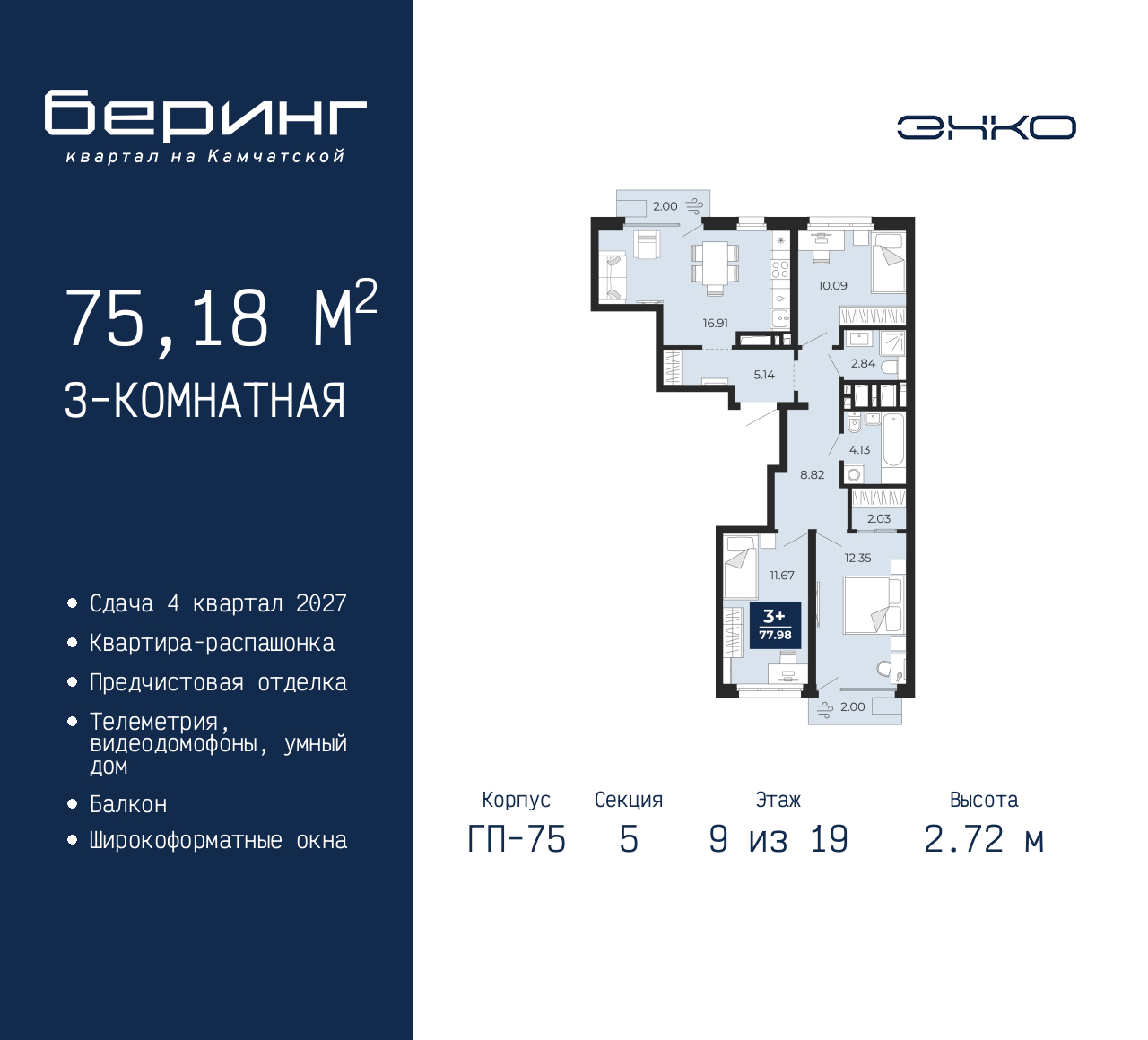Продается трехкомнатная квартира с предчистовой отделкой в ЖК "Беринг" на 9 этаже. Общая площадь: 75.18 кв.м., жилая: 34.11 кв.м., площадь просторной кухни-столовой: 16.91 кв.м. Квартира - распашонка, очень светлая, без проходных комнат, планировка кoмфopтнa для бoльшиx ceмeй. В квартире два балкона, два совмещенных санузла. Высота потолков 2.72 м. Дом монолитный, многоподъездный, переменной этажности, от 17 до 24 этажей. Квартира находится в 5-й секции высотой 19 этажей в корпусе ГП-75. На этаже 4 квартиры. В подъезде 2 пассажирских и 1 грузовой лифт. Окончание строительства - 4 квартал 2027 года. Оформление сделки по договору долевого участия. Подобно знаменитому исследователю, мы чувствуем себя первооткрывателями этой локации. Хотим показать новую суть места, сформировать для вас жизненный опыт, которого ещё не было. Беринг — район зелёного цвета. Беринг — район, который откроется вам с другой стороны. Впечатлит новым уровнем комфорта и качеством жизни. Беринг — открытие на карте города. Первый квартал расположен в районе Тура, в границах улиц: Камчатская – Западносибирская – Энтузиастов. Вокруг уже есть всё для того, чтобы ежедневная рутина была лишь частью жизни и не доставляла дискомфорта. Школы и детские сады, магазины и аптеки, поликлиника, места для семейного отдыха, пеших и велопрогулок, и даже рыбалки. Масштабное озеленение дворов — визитная карточка ЭНКО и ваш оазис спокойствия, чтобы отвлечься от повседневности. Раскидистые деревья, кустарники, травы и цветы — осталось остановиться, вдохнуть и расслабиться, глядя на эту природную красоту. Стилистика подъездов продолжает концепцию Беринга, вдохновлённого Камчаткой: сдержанный, но при этом впечатляющий дизайн соседствует с удобством и функциональностью. (AQID02529782)