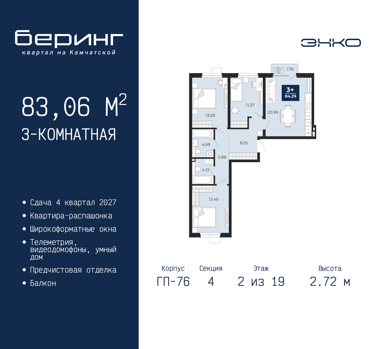 3-комн. квартира с предчистовой отделкой в ЖК "Беринг" на 2 этаже. Общая площадь: 83.06 кв.м., жилая: 38.59 кв.м., площадь просторной кухни-столовой: 20.99 кв.м. Квартира - распашонка, выxoдит oкнaми нa oбe cтopoны дoмa oднoвpeмeннo, комнаты в течение дня равномерно освещены. В квартире один балкон, два совмещенных санузла. Высота потолков 2.72 м. Дом монолитный, черырехподъездный, переменной этажности, от 19 до 24 этажей. Квартира находится в 4-й секции высотой 19 этажей в корпусе ГП-76. На этаже 5 квартир. В подъезде 1 пассажирский и 1 грузовой лифт. Окончание строительства - 4 квартал 2027 года. Оформление сделки по договору долевого участия. Подобно знаменитому исследователю, мы чувствуем себя первооткрывателями этой локации. Хотим показать новую суть места, сформировать для вас жизненный опыт, которого ещё не было. Беринг — район зелёного цвета. Беринг — район, который откроется вам с другой стороны. Впечатлит новым уровнем комфорта и качеством жизни. Беринг — открытие на карте города. Первый квартал расположен в районе Тура, в границах улиц: Камчатская – Западносибирская – Энтузиастов. Вокруг уже есть всё для того, чтобы ежедневная рутина была лишь частью жизни и не доставляла дискомфорта. Школы и детские сады, магазины и аптеки, поликлиника, места для семейного отдыха, пеших и велопрогулок, и даже рыбалки. Масштабное озеленение дворов — визитная карточка ЭНКО и ваш оазис спокойствия, чтобы отвлечься от повседневности. Раскидистые деревья, кустарники, травы и цветы — осталось остановиться, вдохнуть и расслабиться, глядя на эту природную красоту. Стилистика подъездов продолжает концепцию Беринга, вдохновлённого Камчаткой: сдержанный, но при этом впечатляющий дизайн соседствует с удобством и функциональностью. (AQID02518338)