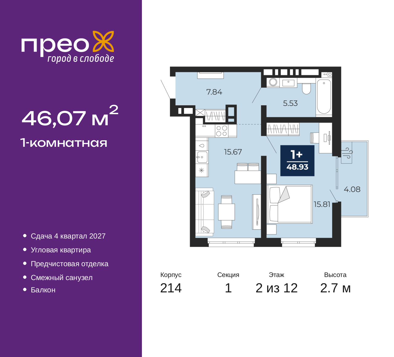 Однокомнатная квартира с предчистовой отделкой в ЖК "Прео" на 2 этаже. Общая площадь: 46.07 кв.м., жилая: 15.81 кв.м., площадь просторной кухни-столовой: 15.67 кв.м. Квартира угловая, идеально подойдет любителям тишины и панорамных видов. В квартире один балкон, один совмещенный санузел. Высота потолков 2.7 м. Дом монолитный, двухподъездный, переменной этажности, от 12 до 20 этажей. Квартира находится в 1-й секции высотой 12 этажей в корпусе 214. На этаже 8 квартир. В подъезде 1 пассажирский и 1 грузовой лифт. Окончание строительства - 4 квартал 2027 года. Оформление сделки по договору долевого участия. Преображенский — один из самых привлекательных районов для жизни! Это полностью самостоятельный жилой район с точки зрения инфраструктуры. Преображенский находится между Московским и Червишевским трактами в квартале улиц Закалужская — Вьюжная — Александра Протозанова. Не нужно ждать, когда появится инфраструктура — переезжайте на всё готовое. Вблизи расположены действующие школа и детский сад. В этом году откроется еще один сад, а в следующем году — школа. По соседству с Преображенским запланировано строительство городского парка «Комарово» площадью 38 гектар. За 10 минут можно доехать на автомобиле до крупных ТРЦ: «Лента», «Кристалл», «Леруа Мерлен», «Метро» и «Ашан». С 2018 года в районе открыт Соседский центр — пространство, созданное для формирования добрососедской среды, совместного досуга, общения и реализации соседских инициатив. Здесь проходят встречи соседей, а также сами жители района организовывают мероприятия. Организатором такого события может стать любой желающий. В квартирах выполнена качественная предчистовая отделка. Гладкие стены с финишным выравниванием по маякам. Ровный потолок для установки натяжного потолка. Установлены пятикамерные окна с двойным стеклопакетом (3 стекла). Дизайнерские холлы с видеонаблюдением, безбарьерным и прозрачным входом – всегда светло и спокойно. На первом этаже есть просторные колясочные, где все жители могут оставлять свои коляски и велосипеды. В Преображенском есть всё, что нужно для активного отдыха и занятий спортом. Мы сделали большое футбольное поле с безопасным покрытием. Также установили хоккейный корт, который оборудован по всем необходимым стандартам. Во дворах можно делать упражнения на специальных площадках с турниками. Весь район мы обустроили велодорожками, которые связаны в единый маршрут. У нас есть сухие фонтаны, бьющие из земли, деревья, веревки, сетки, скалодром, газон, песок и резинка — осталось просто дать своему ребенку право на свободную игру. По-настоящему хорошие дворы — это те, которые дети предпочитают соцсетям и телевизору. Аккредитация в банках: ПАО «Банк Уралсиб», ПАО Банк «ВТБ», ПАО «Газпромбанк», ОАО «Альфа-Банк», «Сбербанк России» и других. (AQID02525499)