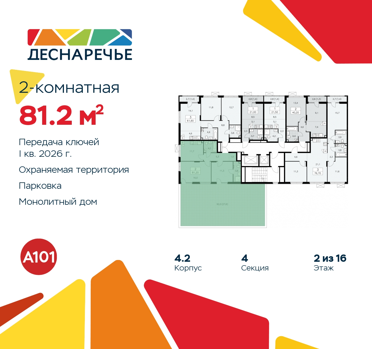 Двухкомнатная квартира от застройщика в ЖК "Деснаречье" на 2 этаже. Квартира без отделки, полностью готова к ремонту. Общая площадь: 81.2 кв.м., жилая: 27.3 кв.м., площадь просторной кухни-столовой: 11.7 кв.м. Угловая квартира, идеально подойдет любителям тишины и панорамных видов. В квартире один балкон, два совмещенных санузла. Терраса представляет собой роскошную зону отдыха для проведение вечеров в кругу семьи и друзей или организация вечеринок. Высота потолков 2.99 м. Эта квартира предлагается без отделки. Будут установлены стеклопакеты с повышенной тепло- и шумоизоляцией, в квартиру заведены все коммуникации. Вы сможете в полном объеме реализовать ваши идеи обустройства вашего комфортного дома. Для тех, кто ценит время и не хочет дополнительных трат на ремонт мы предлагаем квартиры с предчистовой и дизайнерской отделкой. Имеется ниша под гардероб. Дом монолитный, многоподъездный, переменной этажности, от 7 до 16 этажей. Квартира находится в 1-й секции высотой 16 этажей в корпусе 4.2. На этаже 6 квартир. В подъезде 1 пассажирский и 1 грузовой лифт. Начало строительства - 3 квартал 2023 года. Окончание строительства - 1 квартал 2026 года. Оформление сделки по договору долевого участия. Артикул квартиры по базе застройщика 88К-4.2-267. ПРЕДЛОЖЕНИЯ ОТ ЗАСТРОЙЩИКА В ОКТЯБРЕ 2025: Ипотека от 13,9 % для всех! На весь срок. "Семейная ипотека" вернулась. Ставка от 3,5 % на весь срок! Без удорожания! Выгодное ипотечное комбо: Ипотека от 2200 р./мес. и от 6 % после рождения ребёнка! Ипотека для всех "Держи пять!" - ставка 5 % на 2 года! *более подробную информацию по скидкам и акциям уточняйте в отделе продаж Масштабный проект "Деснаречье" на юго-западе Москвы, который включает три новых района («квартала»), объединённые общей идеей – воплотить в реальность мечты современных жителей столицы об интересном, комфортном и разноплановом городском пространстве в окружении рек и лесов, словно сошедших с полотен русских живописцев: - «Берег» оценят все, кому близка водная стихия: плеск волн, солнечные блики и прогулки вдоль тихого течения речи. - «Лес» утопает в зелени парков и лесов. Здесь соблюдён идеальный баланс загородного спокойствия и столичного комфорта. - «Парк», самый энергичный и яркий, отличается высокой концентрацией пространств для спорта и творчества. Жилой комплекс "Деснаречье" расположится в 12 км от МКАД по современному Калужскому шоссе. Внешний облик зданий соответствует современному стилю и стандартам, характерным и для других популярных проектов ГК «А101»: сочетание контрастных тонов, большое количество остекления, в котором отражается небо, гармония с природным окружением. Весь город - в вашем районе. Находиться на территории «15-минутного города» значит иметь всё необходимое для полноценной жизни в шаговой доступности. Маршруты в районе «Деснаречье» выстроены так, чтобы добраться до магазинов, парков, школ, салонов услуг и других объектов можно было всего за несколько минут пешком или на велосипеде. Двор закрытый от машин – это тишина, комфорт и безопасность, поэтому все машино-места (включая «семейные» и увеличенные, с возможностью установки роллетных шкафов) находятся в подземном паркинге. В паркинги можно спуститься на лифте из любого подъезда или по лестнице. Рядом с «Деснаречьем» в 2027 году планируется открытие станции метро «Десна», до которой будет удобно д