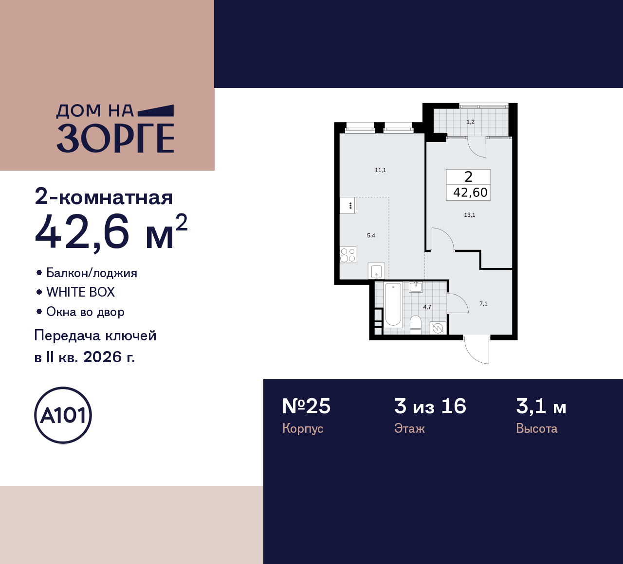 Двухкомнатная квартира с европланировкой и предчистовой отделкой в ЖК "Дом на Зорге" на 3 этаже. Общая площадь: 42.6 кв.м., жилая: 24.2 кв.м., суммарная площадь гостиной-столовой с кухонной зоной: 16.5 кв.м. Европейская планировка, кухня-гостиная - идеальный вариант для тех, кто любит часто принимать гостей. Комнаты изолированные, все окна выходят на одну сторону. В квартире одна лоджия, один совмещенный санузел. Высота потолков 3.1 м. Дом монолитный, двухподъездный, высотой 16 этажей. Квартира находится во 2-й секции в корпусе 25. На этаже 8 квартир. В подъезде 1 пассажирский и 1 грузовой лифт. Начало строительства - 2 квартал 2023 года. Окончание строительства - 1 квартал 2026 года. Оформление сделки по договору долевого участия. Артикул квартиры по базе застройщика 25К-25-204. В шаговой доступности от дома находятся станции метро (расстояние по прямой): «Зорге» (500 м), «Октябрьское поле» (800 м), «Панфиловская» (900 м), «Сокол» (1.6 км), «Хорошево» (1.6 км). ПРЕДЛОЖЕНИЯ ОТ ЗАСТРОЙЩИКА В ОКТЯБРЕ 2025: Ипотека от 13,9 % для всех! На весь срок. "Семейная ипотека" вернулась. Ставка от 3,5 % на весь срок! Без удорожания! Выгодное ипотечное комбо: Ипотека от 2200 р./мес. и от 6 % после рождения ребёнка! Ипотека для всех "Держи пять!" - ставка 5 % на 2 года! *более подробную информацию по скидкам и акциям уточняйте в отделе продаж "Дом на Зорге"» бизнес-класса возводится в престижном районе «Сокол» с исторической «сталинской» застройкой и статусными жилыми комплексами на границе с Хорошёвским районом Северо-Западного АО. До действующей станции метро (и МЦК) «Зорге» всего 350 метров. «Дом на Зорге» отличается элегантным и статусным внешним видом – идеально соответствует «дресс-коду» исторического окружения и в тоже время обращает на себя внимание. Вентилируемые фасады облицованы фиброцементными и керамогранитными панелями, которые повторяют фактуру натурального камня и бетона. Кондиционеры скроют корзины и стильные блоки, расположенные в декоративных элементах фасада. Мягкая архитектурно-художественная подсветка подчеркнёт благородный экстерьер дома. Сформированная инфраструктура района предоставит жителям богатый выбор мест для отдыха, шопинга и занятий спортом. На первом этаже «Дома на Зорге» откроются уютные магазины, атмосферные кафе и салоны красоты с отличным сервисом. Здесь предусмотрено всё для удобства, позитивного настроения и безопасности жителей. В закрытый двор не войдут посторонние. Автомобили останутся за периметром или в подземном паркинге. Две 16-этажных секции дома соединит лобби с дизайнерской отделкой. Оно станет стильным общественным пространством и главным входом для жителей, также ведущим в скрытый от посторонних глаз приватный внутренний двор. Всего в локации – более четырёх десятков разнообразных учебных учреждений для детей, включая легендарную «Курчатовскую школу». В шаговой доступности находятся корпуса школы № 1251 имени генерала Шарля де Голля – с дошкольным отделением. На территории дома будут благоустроены общий и приватный (доступный только жителям) дворы. Дизайн каждой функциональной зоны уникален, а вместе они подчёркивают благородный архитектурный стиль здания. В основе цветовых решений – «отражение» фасадов, мягкие природные оттенки. (AQID02517849)