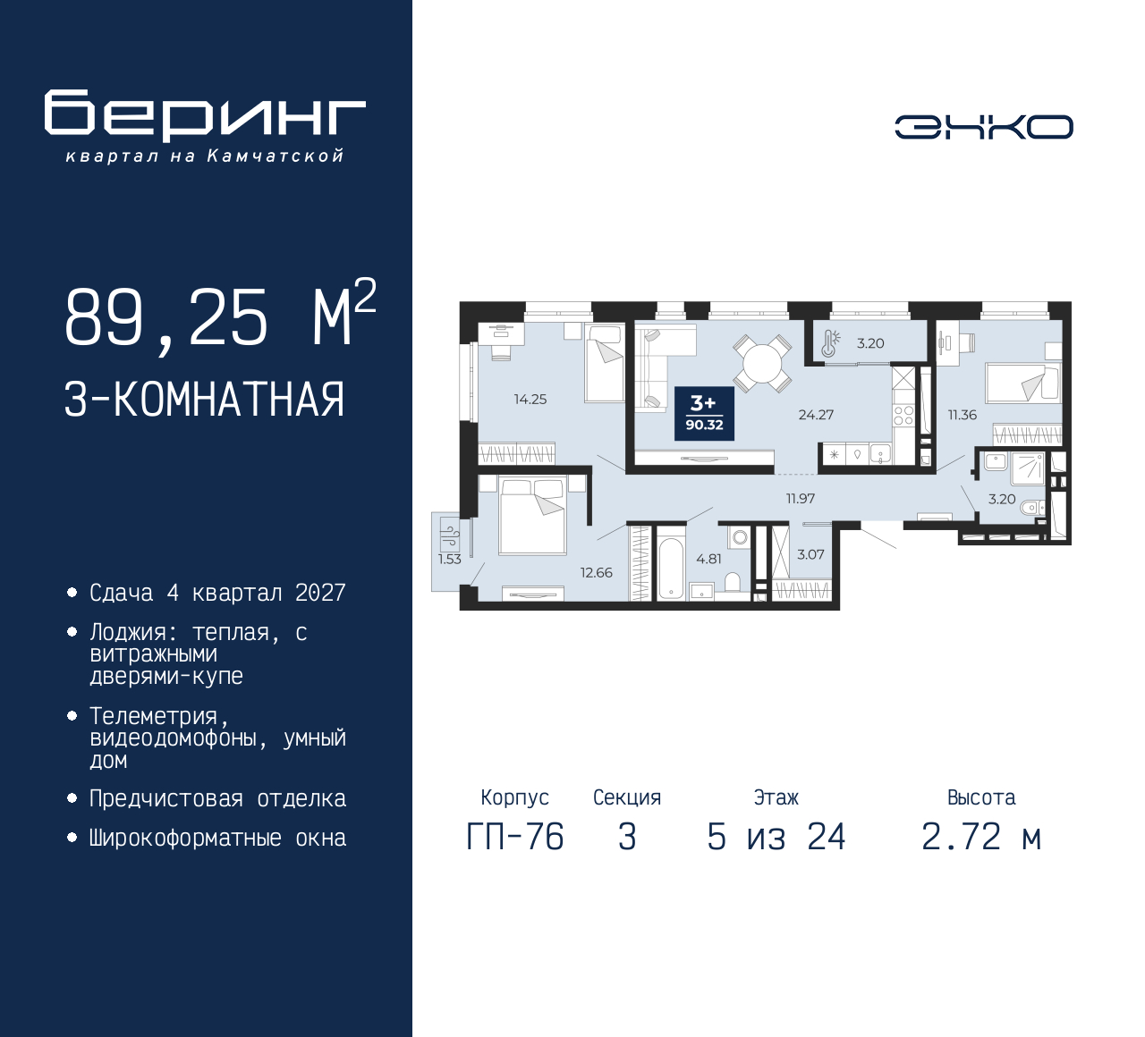 Трехкомнатная квартира с предчистовой отделкой в ЖК "Беринг" на 5 этаже. Общая площадь: 89.25 кв.м., жилая: 38.27 кв.м., площадь просторной кухни-столовой: 24.27 кв.м. Угловая квартира, идеально подойдет любителям тишины и панорамных видов. В квартире один балкон и одна лоджия, два совмещенных санузла. Высота потолков 2.72 м. Дом монолитный, черырехподъездный, переменной этажности, от 19 до 24 этажей. Квартира находится в 3-й секции высотой 24 этажа в корпусе ГП-76. На этаже 6 квартир. В подъезде 1 пассажирский и 1 грузовой лифт. Окончание строительства - 4 квартал 2027 года. Оформление сделки по договору долевого участия. Подобно знаменитому исследователю, мы чувствуем себя первооткрывателями этой локации. Хотим показать новую суть места, сформировать для вас жизненный опыт, которого ещё не было. Беринг — район зелёного цвета. Беринг — район, который откроется вам с другой стороны. Впечатлит новым уровнем комфорта и качеством жизни. Беринг — открытие на карте города. Первый квартал расположен в районе Тура, в границах улиц: Камчатская – Западносибирская – Энтузиастов. Вокруг уже есть всё для того, чтобы ежедневная рутина была лишь частью жизни и не доставляла дискомфорта. Школы и детские сады, магазины и аптеки, поликлиника, места для семейного отдыха, пеших и велопрогулок, и даже рыбалки. Масштабное озеленение дворов — визитная карточка ЭНКО и ваш оазис спокойствия, чтобы отвлечься от повседневности. Раскидистые деревья, кустарники, травы и цветы — осталось остановиться, вдохнуть и расслабиться, глядя на эту природную красоту. Стилистика подъездов продолжает концепцию Беринга, вдохновлённого Камчаткой: сдержанный, но при этом впечатляющий дизайн соседствует с удобством и функциональностью. (AQID02529336)