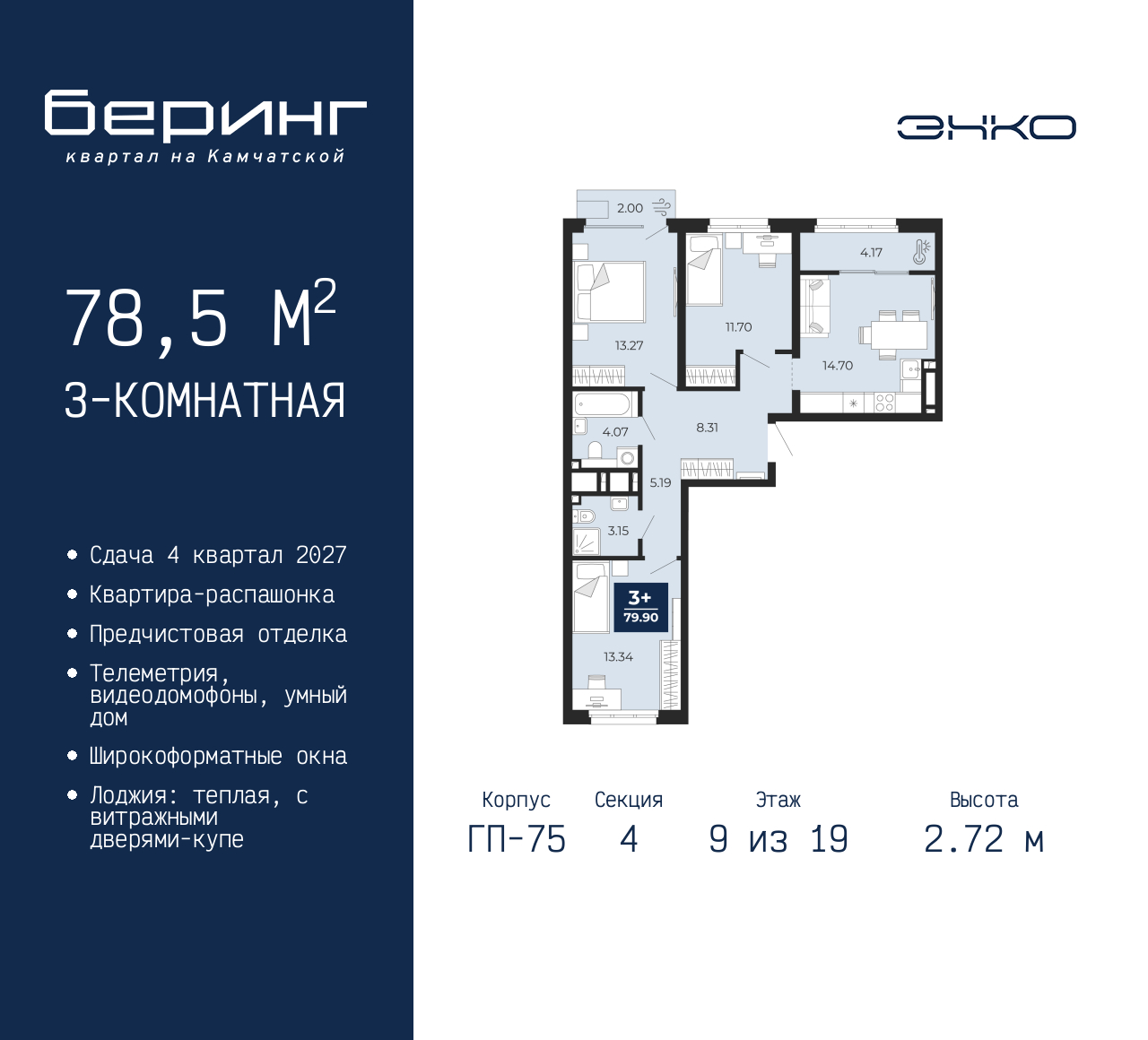 Трехкомнатная квартира от застройщика с предчистовой отделкой в ЖК "Беринг" на 9 этаже. Общая площадь: 78.5 кв.м., жилая: 38.31 кв.м., площадь просторной кухни-столовой: 14.7 кв.м. Квартира - распашонка, без проходных комнат, окна выходят на paзные стороны дома. В квартире один балкон и одна лоджия, два совмещенных санузла. Высота потолков 2.72 м. Дом монолитный, многоподъездный, переменной этажности, от 17 до 24 этажей. Квартира находится в 4-й секции высотой 19 этажей в корпусе ГП-75. На этаже 4 квартиры. В подъезде 2 пассажирских и 1 грузовой лифт. Окончание строительства - 4 квартал 2027 года. Оформление сделки по договору долевого участия. Подобно знаменитому исследователю, мы чувствуем себя первооткрывателями этой локации. Хотим показать новую суть места, сформировать для вас жизненный опыт, которого ещё не было. Беринг — район зелёного цвета. Беринг — район, который откроется вам с другой стороны. Впечатлит новым уровнем комфорта и качеством жизни. Беринг — открытие на карте города. Первый квартал расположен в районе Тура, в границах улиц: Камчатская – Западносибирская – Энтузиастов. Вокруг уже есть всё для того, чтобы ежедневная рутина была лишь частью жизни и не доставляла дискомфорта. Школы и детские сады, магазины и аптеки, поликлиника, места для семейного отдыха, пеших и велопрогулок, и даже рыбалки. Масштабное озеленение дворов — визитная карточка ЭНКО и ваш оазис спокойствия, чтобы отвлечься от повседневности. Раскидистые деревья, кустарники, травы и цветы — осталось остановиться, вдохнуть и расслабиться, глядя на эту природную красоту. Стилистика подъездов продолжает концепцию Беринга, вдохновлённого Камчаткой: сдержанный, но при этом впечатляющий дизайн соседствует с удобством и функциональностью. (AQID02529791)
