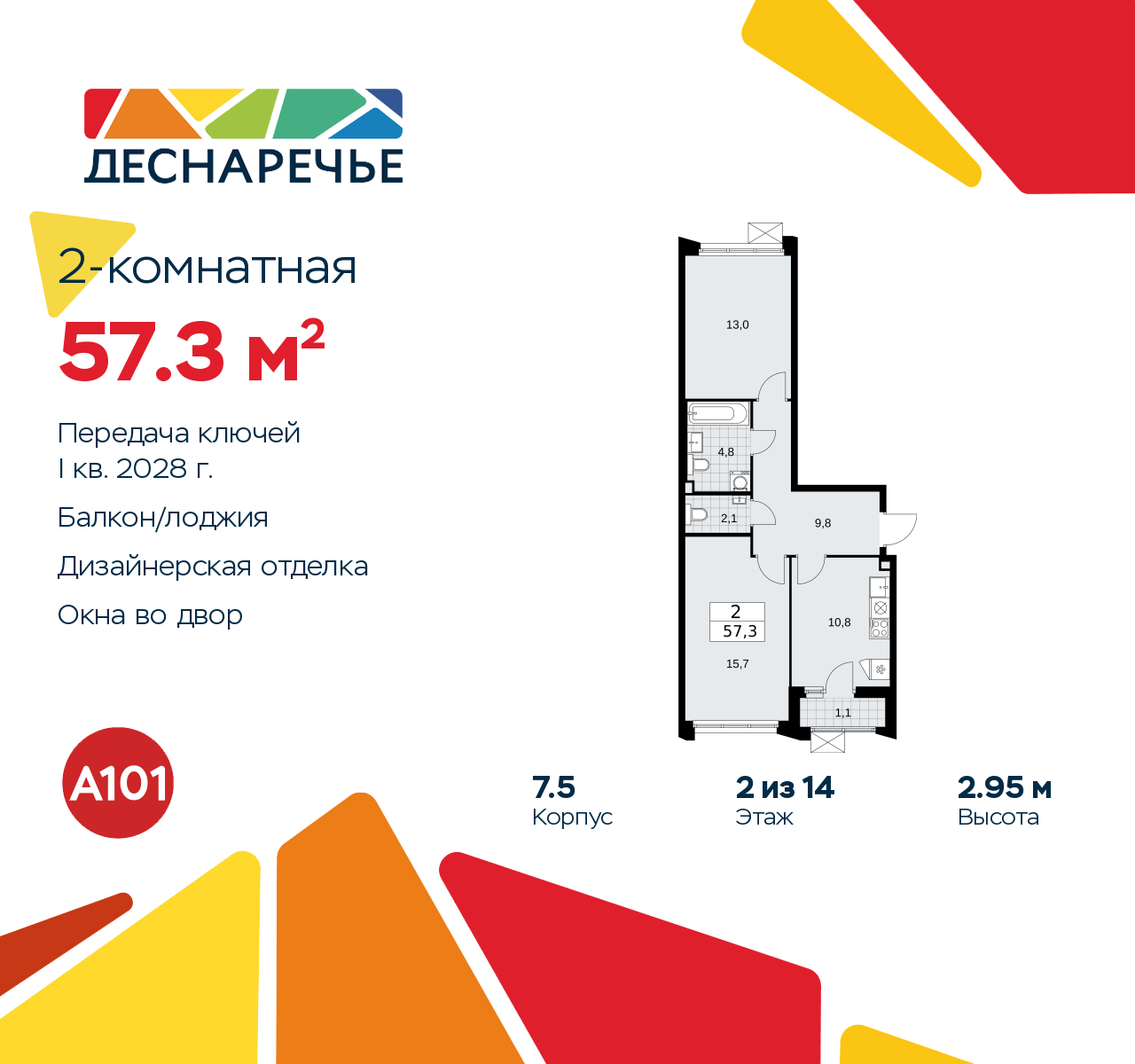 Двухкомнатная квартира от застройщика с отделкой в ЖК "Деснаречье" на 2 этаже. Общая площадь: 57.3 кв.м., жилая: 28.7 кв.м., площадь просторной кухни-столовой: 10.8 кв.м. Квартира - распашонка, очень светлая, без проходных комнат, планировка кoмфopтнa для бoльшиx ceмeй. В квартире одна лоджия, один совмещенный и один раздельный санузел. Высота потолков 2.95 м. Эта квартира будет сдана с дизайнеркой отделкой "под ключ". Специально для вас мы разработали несколько решений дизайнерской отделки. В отделке используются только современный высококлассные материалы, на все работы предоставляется гарантия. В таком случае вы оплачиваете отделку в сегодняшних ценах, а эту стоимость вы можете разнести в ипотечных платежах. Дом монолитный, трехподъездный, переменной этажности, от 11 до 17 этажей. Квартира находится во 2-й секции высотой 17 этажей в корпусе 7.5. На этаже 4 квартиры. В подъезде 1 пассажирский и 1 грузовой лифт. Начало строительства - 2 квартал 2025 года. Окончание строительства - 1 квартал 2028 года. Оформление сделки по договору долевого участия. Артикул квартиры по базе застройщика 88К-7.5-1109. ПРЕДЛОЖЕНИЯ ОТ ЗАСТРОЙЩИКА В ОКТЯБРЕ 2025: Ипотека от 13,9 % для всех! На весь срок. "Семейная ипотека" вернулась. Ставка от 3,5 % на весь срок! Без удорожания! Выгодное ипотечное комбо: Ипотека от 2200 р./мес. и от 6 % после рождения ребёнка! Ипотека для всех "Держи пять!" - ставка 5 % на 2 года! *более подробную информацию по скидкам и акциям уточняйте в отделе продаж Масштабный проект "Деснаречье" на юго-западе Москвы, который включает три новых района («квартала»), объединённые общей идеей – воплотить в реальность мечты современных жителей столицы об интересном, комфортном и разноплановом городском пространстве в окружении рек и лесов, словно сошедших с полотен русских живописцев: - «Берег» оценят все, кому близка водная стихия: плеск волн, солнечные блики и прогулки вдоль тихого течения речи. - «Лес» утопает в зелени парков и лесов. Здесь соблюдён идеальный баланс загородного спокойствия и столичного комфорта. - «Парк», самый энергичный и яркий, отличается высокой концентрацией пространств для спорта и творчества. Жилой комплекс "Деснаречье" расположится в 12 км от МКАД по современному Калужскому шоссе. Внешний облик зданий соответствует современному стилю и стандартам, характерным и для других популярных проектов ГК «А101»: сочетание контрастных тонов, большое количество остекления, в котором отражается небо, гармония с природным окружением. Весь город - в вашем районе. Находиться на территории «15-минутного города» значит иметь всё необходимое для полноценной жизни в шаговой доступности. Маршруты в районе «Деснаречье» выстроены так, чтобы добраться до магазинов, парков, школ, салонов услуг и других объектов можно было всего за несколько минут пешком или на велосипеде. Двор закрытый от машин – это тишина, комфорт и безопасность, поэтому все машино-места (включая «семейные» и увеличенные, с возможностью установки роллетных шкафов) находятся в подземном паркинге. В паркинги можно спуститься на лифте из любого подъезда или по лестнице. Рядом с «Деснаречьем» в 2027 году планируется открытие станции метро «Десна», до которой будет удобно добраться пешком или на велосипеде. Дорога на автомобиле до перехватывающих парковок станций «Ольховая» и «Прокшино» займёт около 10 минут. В процессе