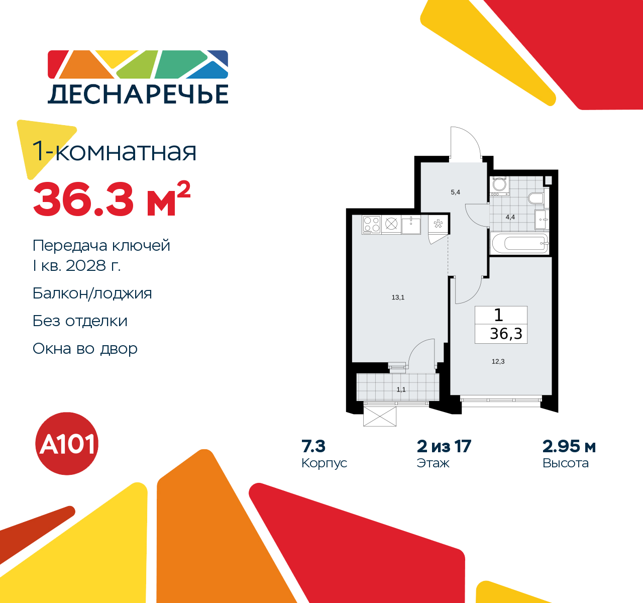 Продается 1-комн. квартира в ЖК "Деснаречье" на 2 этаже. Квартира без отделки, новый владелец может сделать ремонт по индивидуальному дизайн-проекту. Общая площадь: 36.3 кв.м., жилая: 12.3 кв.м., площадь просторной кухни-столовой: 13.1 кв.м. Все окна выходят на одну сторону. В квартире одна лоджия, один совмещенный санузел. Высота потолков 2.95 м. Эта квартира предлагается без отделки. Будут установлены стеклопакеты с повышенной тепло- и шумоизоляцией, в квартиру заведены все коммуникации. Вы сможете в полном объеме реализовать ваши идеи обустройства вашего комфортного дома. Для тех, кто ценит время и не хочет дополнительных трат на ремонт мы предлагаем квартиры с предчистовой и дизайнерской отделкой. Дом монолитный, черырехподъездный, переменной этажности, от 9 до 17 этажей. Квартира находится в 1-й секции высотой 15 этажей в корпусе 7.3. На этаже 5 квартир. В подъезде 1 пассажирский и 1 грузовой лифт. Начало строительства - 2 квартал 2025 года. Окончание строительства - 1 квартал 2028 года. Оформление сделки по договору долевого участия. Артикул квартиры по базе застройщика 88К-7.3-591. ПРЕДЛОЖЕНИЯ ОТ ЗАСТРОЙЩИКА В ОКТЯБРЕ 2025: Ипотека от 13,9 % для всех! На весь срок. "Семейная ипотека" вернулась. Ставка от 3,5 % на весь срок! Без удорожания! Выгодное ипотечное комбо: Ипотека от 2200 р./мес. и от 6 % после рождения ребёнка! Ипотека для всех "Держи пять!" - ставка 5 % на 2 года! *более подробную информацию по скидкам и акциям уточняйте в отделе продаж Масштабный проект "Деснаречье" на юго-западе Москвы, который включает три новых района («квартала»), объединённые общей идеей – воплотить в реальность мечты современных жителей столицы об интересном, комфортном и разноплановом городском пространстве в окружении рек и лесов, словно сошедших с полотен русских живописцев: - «Берег» оценят все, кому близка водная стихия: плеск волн, солнечные блики и прогулки вдоль тихого течения речи. - «Лес» утопает в зелени парков и лесов. Здесь соблюдён идеальный баланс загородного спокойствия и столичного комфорта. - «Парк», самый энергичный и яркий, отличается высокой концентрацией пространств для спорта и творчества. Жилой комплекс "Деснаречье" расположится в 12 км от МКАД по современному Калужскому шоссе. Внешний облик зданий соответствует современному стилю и стандартам, характерным и для других популярных проектов ГК «А101»: сочетание контрастных тонов, большое количество остекления, в котором отражается небо, гармония с природным окружением. Весь город - в вашем районе. Находиться на территории «15-минутного города» значит иметь всё необходимое для полноценной жизни в шаговой доступности. Маршруты в районе «Деснаречье» выстроены так, чтобы добраться до магазинов, парков, школ, салонов услуг и других объектов можно было всего за несколько минут пешком или на велосипеде. Двор закрытый от машин – это тишина, комфорт и безопасность, поэтому все машино-места (включая «семейные» и увеличенные, с возможностью установки роллетных шкафов) находятся в подземном паркинге. В паркинги можно спуститься на лифте из любого подъезда или по лестнице. Рядом с «Деснаречьем» в 2027 году планируется открытие станции метро «Десна», до которой будет удобно добраться пешком или на велосипеде. Дорога на автомобиле до перехватывающих парковок станций «Ольховая» и «Прокшино» займёт около 10 минут. В процессе реали
