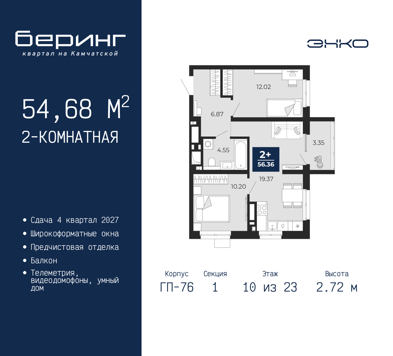 Двухкомнатная квартира с предчистовой отделкой в ЖК "Беринг" на 10 этаже. Общая площадь: 54.68 кв.м., жилая: 22.22 кв.м., площадь просторной кухни-столовой: 19.37 кв.м. Угловая квартира, очень светлая, естественная вентиляция при открытии окон. В квартире один балкон, один совмещенный санузел. Высота потолков 2.72 м. Дом монолитный, черырехподъездный, переменной этажности, от 19 до 24 этажей. Квартира находится в 1-й секции высотой 23 этажа в корпусе ГП-76. На этаже 7 квартир. В подъезде 2 пассажирских и 1 грузовой лифт. Окончание строительства - 4 квартал 2027 года. Оформление сделки по договору долевого участия. Подобно знаменитому исследователю, мы чувствуем себя первооткрывателями этой локации. Хотим показать новую суть места, сформировать для вас жизненный опыт, которого ещё не было. Беринг — район зелёного цвета. Беринг — район, который откроется вам с другой стороны. Впечатлит новым уровнем комфорта и качеством жизни. Беринг — открытие на карте города. Первый квартал расположен в районе Тура, в границах улиц: Камчатская – Западносибирская – Энтузиастов. Вокруг уже есть всё для того, чтобы ежедневная рутина была лишь частью жизни и не доставляла дискомфорта. Школы и детские сады, магазины и аптеки, поликлиника, места для семейного отдыха, пеших и велопрогулок, и даже рыбалки. Масштабное озеленение дворов — визитная карточка ЭНКО и ваш оазис спокойствия, чтобы отвлечься от повседневности. Раскидистые деревья, кустарники, травы и цветы — осталось остановиться, вдохнуть и расслабиться, глядя на эту природную красоту. Стилистика подъездов продолжает концепцию Беринга, вдохновлённого Камчаткой: сдержанный, но при этом впечатляющий дизайн соседствует с удобством и функциональностью. (AQID02517998)