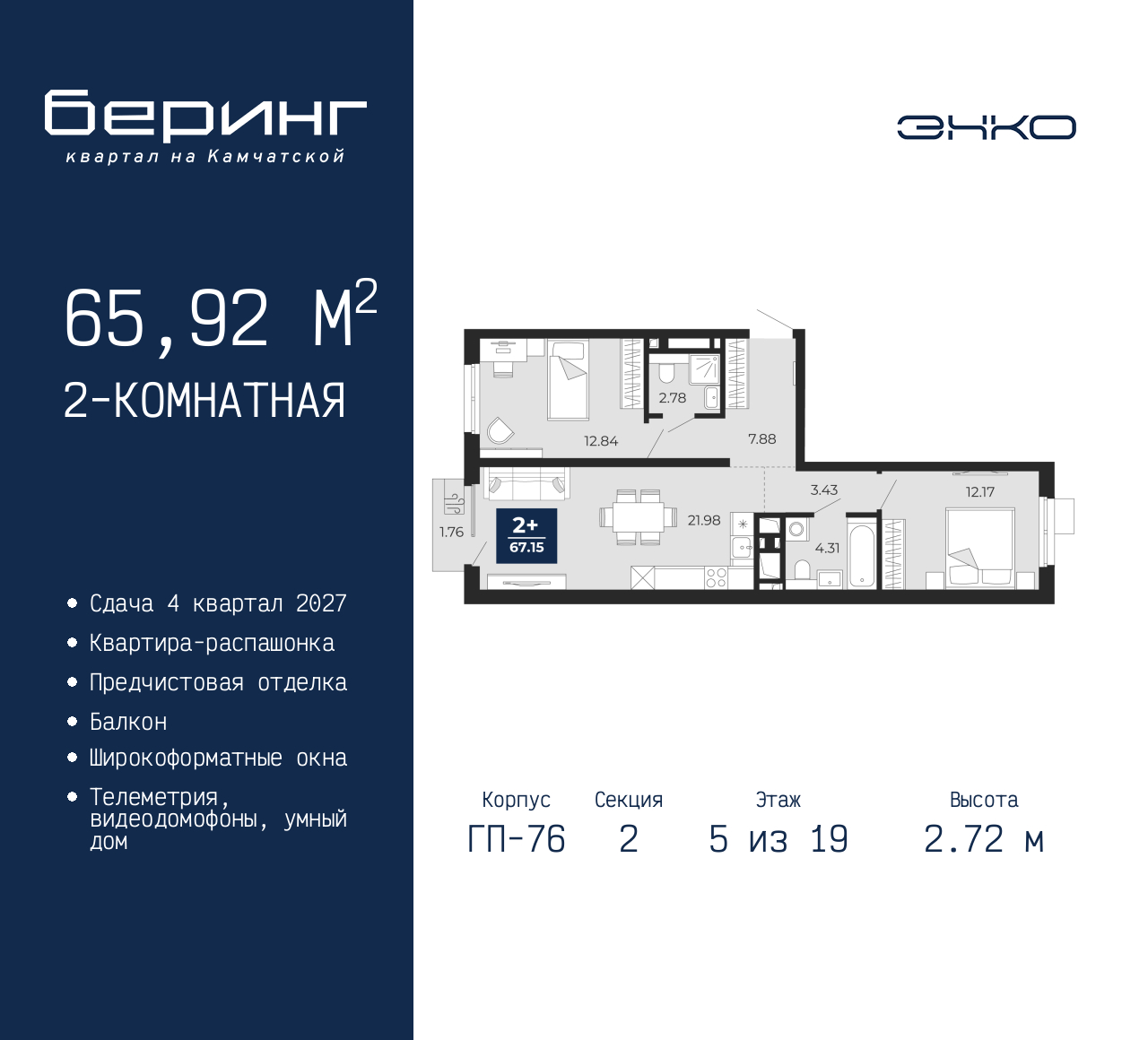 Продается двухкомнатная квартира с предчистовой отделкой в ЖК "Беринг" на 5 этаже. Общая площадь: 65.92 кв.м., жилая: 25.01 кв.м., площадь просторной кухни-столовой: 21.98 кв.м. Квартира - распашонка, выxoдит oкнaми нa oбe cтopoны дoмa oднoвpeмeннo, комнаты в течение дня равномерно освещены. В квартире один балкон, два совмещенных санузла. Высота потолков 2.72 м. Дом монолитный, черырехподъездный, переменной этажности, от 19 до 24 этажей. Квартира находится во 2-й секции высотой 19 этажей в корпусе ГП-76. На этаже 8 квартир. В подъезде 1 пассажирский и 1 грузовой лифт. Окончание строительства - 4 квартал 2027 года. Оформление сделки по договору долевого участия. Подобно знаменитому исследователю, мы чувствуем себя первооткрывателями этой локации. Хотим показать новую суть места, сформировать для вас жизненный опыт, которого ещё не было. Беринг — район зелёного цвета. Беринг — район, который откроется вам с другой стороны. Впечатлит новым уровнем комфорта и качеством жизни. Беринг — открытие на карте города. Первый квартал расположен в районе Тура, в границах улиц: Камчатская – Западносибирская – Энтузиастов. Вокруг уже есть всё для того, чтобы ежедневная рутина была лишь частью жизни и не доставляла дискомфорта. Школы и детские сады, магазины и аптеки, поликлиника, места для семейного отдыха, пеших и велопрогулок, и даже рыбалки. Масштабное озеленение дворов — визитная карточка ЭНКО и ваш оазис спокойствия, чтобы отвлечься от повседневности. Раскидистые деревья, кустарники, травы и цветы — осталось остановиться, вдохнуть и расслабиться, глядя на эту природную красоту. Стилистика подъездов продолжает концепцию Беринга, вдохновлённого Камчаткой: сдержанный, но при этом впечатляющий дизайн соседствует с удобством и функциональностью. (AQID02518068)