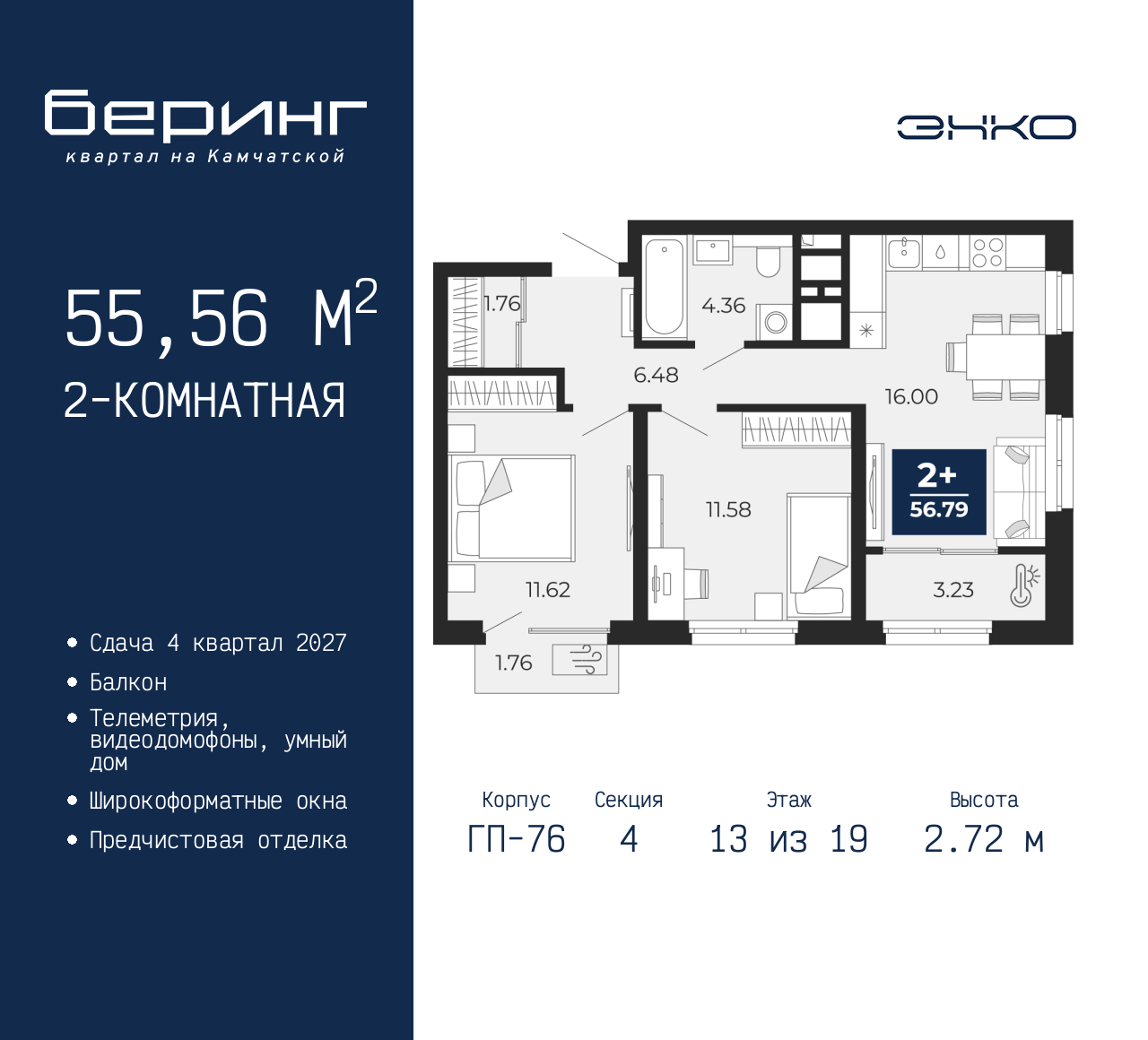 Двухкомнатная квартира с предчистовой отделкой в ЖК "Беринг" на 13 этаже. Общая площадь: 55.56 кв.м., жилая: 23.2 кв.м., площадь просторной кухни-столовой: 16 кв.м. Квартира угловая, идеально подойдет любителям тишины и панорамных видов. В квартире один балкон, один совмещенный санузел. Высота потолков 2.72 м. Дом монолитный, черырехподъездный, переменной этажности, от 19 до 24 этажей. Квартира находится в 4-й секции высотой 19 этажей в корпусе ГП-76. На этаже 5 квартир. В подъезде 1 пассажирский и 1 грузовой лифт. Окончание строительства - 4 квартал 2027 года. Оформление сделки по договору долевого участия. Подобно знаменитому исследователю, мы чувствуем себя первооткрывателями этой локации. Хотим показать новую суть места, сформировать для вас жизненный опыт, которого ещё не было. Беринг — район зелёного цвета. Беринг — район, который откроется вам с другой стороны. Впечатлит новым уровнем комфорта и качеством жизни. Беринг — открытие на карте города. Первый квартал расположен в районе Тура, в границах улиц: Камчатская – Западносибирская – Энтузиастов. Вокруг уже есть всё для того, чтобы ежедневная рутина была лишь частью жизни и не доставляла дискомфорта. Школы и детские сады, магазины и аптеки, поликлиника, места для семейного отдыха, пеших и велопрогулок, и даже рыбалки. Масштабное озеленение дворов — визитная карточка ЭНКО и ваш оазис спокойствия, чтобы отвлечься от повседневности. Раскидистые деревья, кустарники, травы и цветы — осталось остановиться, вдохнуть и расслабиться, глядя на эту природную красоту. Стилистика подъездов продолжает концепцию Беринга, вдохновлённого Камчаткой: сдержанный, но при этом впечатляющий дизайн соседствует с удобством и функциональностью. (AQID02518369)
