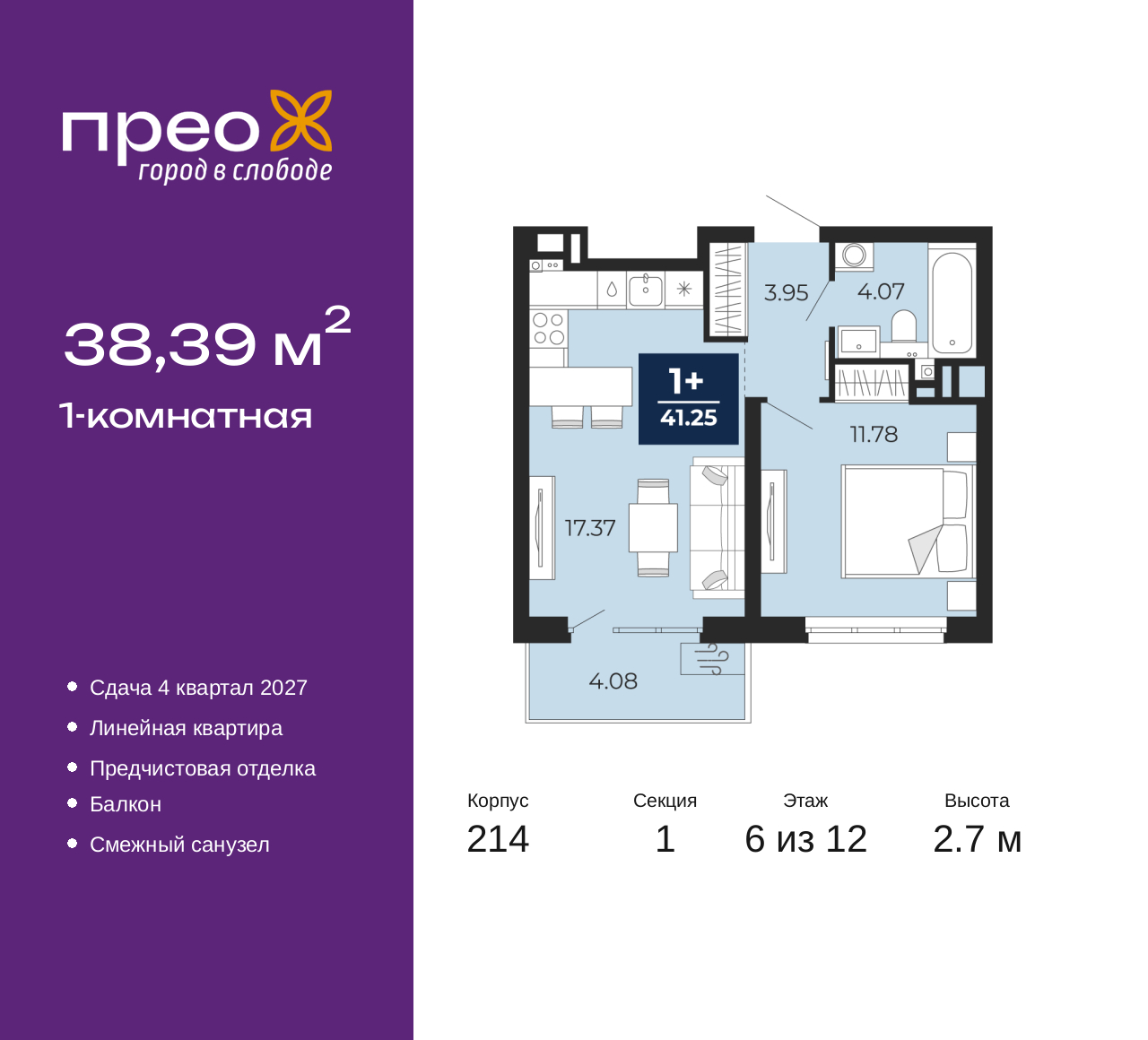 Продается однокомнатная квартира от застройщика с предчистовой отделкой в ЖК "Прео" на 6 этаже. Общая площадь: 38.39 кв.м., жилая: 11.78 кв.м., площадь просторной кухни-столовой: 17.37 кв.м. Все окна выходят на одну сторону. В квартире один балкон, один совмещенный санузел. Высота потолков 2.7 м. Дом монолитный, двухподъездный, переменной этажности, от 12 до 20 этажей. Квартира находится в 1-й секции высотой 12 этажей в корпусе 214. На этаже 8 квартир. В подъезде 1 пассажирский и 1 грузовой лифт. Окончание строительства - 4 квартал 2027 года. Оформление сделки по договору долевого участия. Преображенский — один из самых привлекательных районов для жизни! Это полностью самостоятельный жилой район с точки зрения инфраструктуры. Преображенский находится между Московским и Червишевским трактами в квартале улиц Закалужская — Вьюжная — Александра Протозанова. Не нужно ждать, когда появится инфраструктура — переезжайте на всё готовое. Вблизи расположены действующие школа и детский сад. В этом году откроется еще один сад, а в следующем году — школа. По соседству с Преображенским запланировано строительство городского парка «Комарово» площадью 38 гектар. За 10 минут можно доехать на автомобиле до крупных ТРЦ: «Лента», «Кристалл», «Леруа Мерлен», «Метро» и «Ашан». С 2018 года в районе открыт Соседский центр — пространство, созданное для формирования добрососедской среды, совместного досуга, общения и реализации соседских инициатив. Здесь проходят встречи соседей, а также сами жители района организовывают мероприятия. Организатором такого события может стать любой желающий. В квартирах выполнена качественная предчистовая отделка. Гладкие стены с финишным выравниванием по маякам. Ровный потолок для установки натяжного потолка. Установлены пятикамерные окна с двойным стеклопакетом (3 стекла). Дизайнерские холлы с видеонаблюдением, безбарьерным и прозрачным входом – всегда светло и спокойно. На первом этаже есть просторные колясочные, где все жители могут оставлять свои коляски и велосипеды. В Преображенском есть всё, что нужно для активного отдыха и занятий спортом. Мы сделали большое футбольное поле с безопасным покрытием. Также установили хоккейный корт, который оборудован по всем необходимым стандартам. Во дворах можно делать упражнения на специальных площадках с турниками. Весь район мы обустроили велодорожками, которые связаны в единый маршрут. У нас есть сухие фонтаны, бьющие из земли, деревья, веревки, сетки, скалодром, газон, песок и резинка — осталось просто дать своему ребенку право на свободную игру. По-настоящему хорошие дворы — это те, которые дети предпочитают соцсетям и телевизору. Аккредитация в банках: ПАО Банк «ВТБ», «Сбербанк России», ПАО «Газпромбанк», ОАО «Альфа-Банк», ПАО «Банк Уралсиб» и других. (AQID02525474)