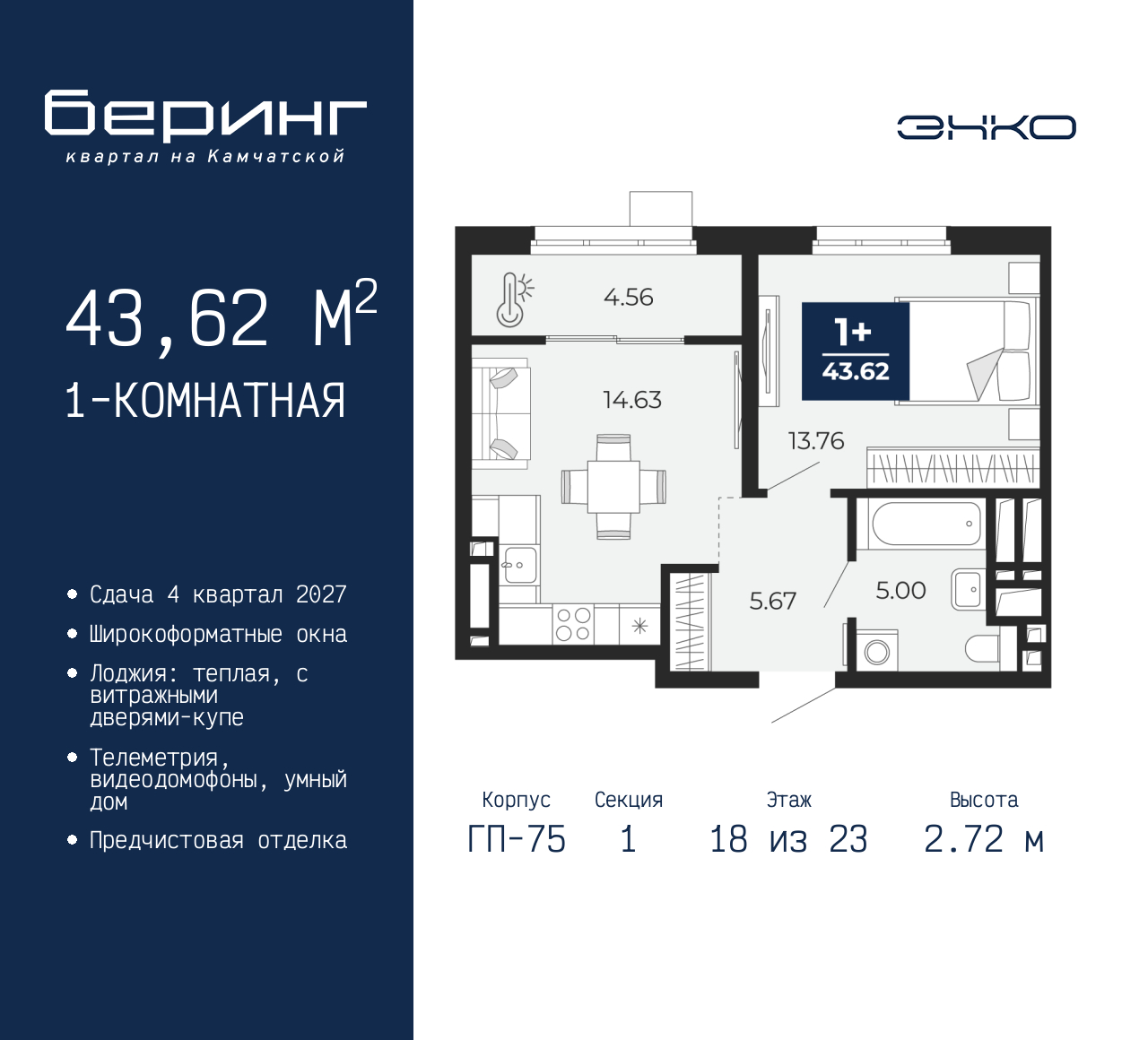 Однокомнатная квартира с предчистовой отделкой в ЖК "Беринг" на 18 этаже. Общая площадь: 43.62 кв.м., жилая: 13.76 кв.м., площадь просторной кухни-столовой: 14.63 кв.м. Все окна выходят на одну сторону. В квартире одна лоджия, один совмещенный санузел. Высота потолков 2.72 м. Дом монолитный, многоподъездный, переменной этажности, от 17 до 24 этажей. Квартира находится в 1-й секции высотой 23 этажа в корпусе ГП-75. На этаже 8 квартир. В подъезде 2 пассажирских и 1 грузовой лифт. Окончание строительства - 4 квартал 2027 года. Оформление сделки по договору долевого участия. Подобно знаменитому исследователю, мы чувствуем себя первооткрывателями этой локации. Хотим показать новую суть места, сформировать для вас жизненный опыт, которого ещё не было. Беринг — район зелёного цвета. Беринг — район, который откроется вам с другой стороны. Впечатлит новым уровнем комфорта и качеством жизни. Беринг — открытие на карте города. Первый квартал расположен в районе Тура, в границах улиц: Камчатская – Западносибирская – Энтузиастов. Вокруг уже есть всё для того, чтобы ежедневная рутина была лишь частью жизни и не доставляла дискомфорта. Школы и детские сады, магазины и аптеки, поликлиника, места для семейного отдыха, пеших и велопрогулок, и даже рыбалки. Масштабное озеленение дворов — визитная карточка ЭНКО и ваш оазис спокойствия, чтобы отвлечься от повседневности. Раскидистые деревья, кустарники, травы и цветы — осталось остановиться, вдохнуть и расслабиться, глядя на эту природную красоту. Стилистика подъездов продолжает концепцию Беринга, вдохновлённого Камчаткой: сдержанный, но при этом впечатляющий дизайн соседствует с удобством и функциональностью. (AQID02529632)