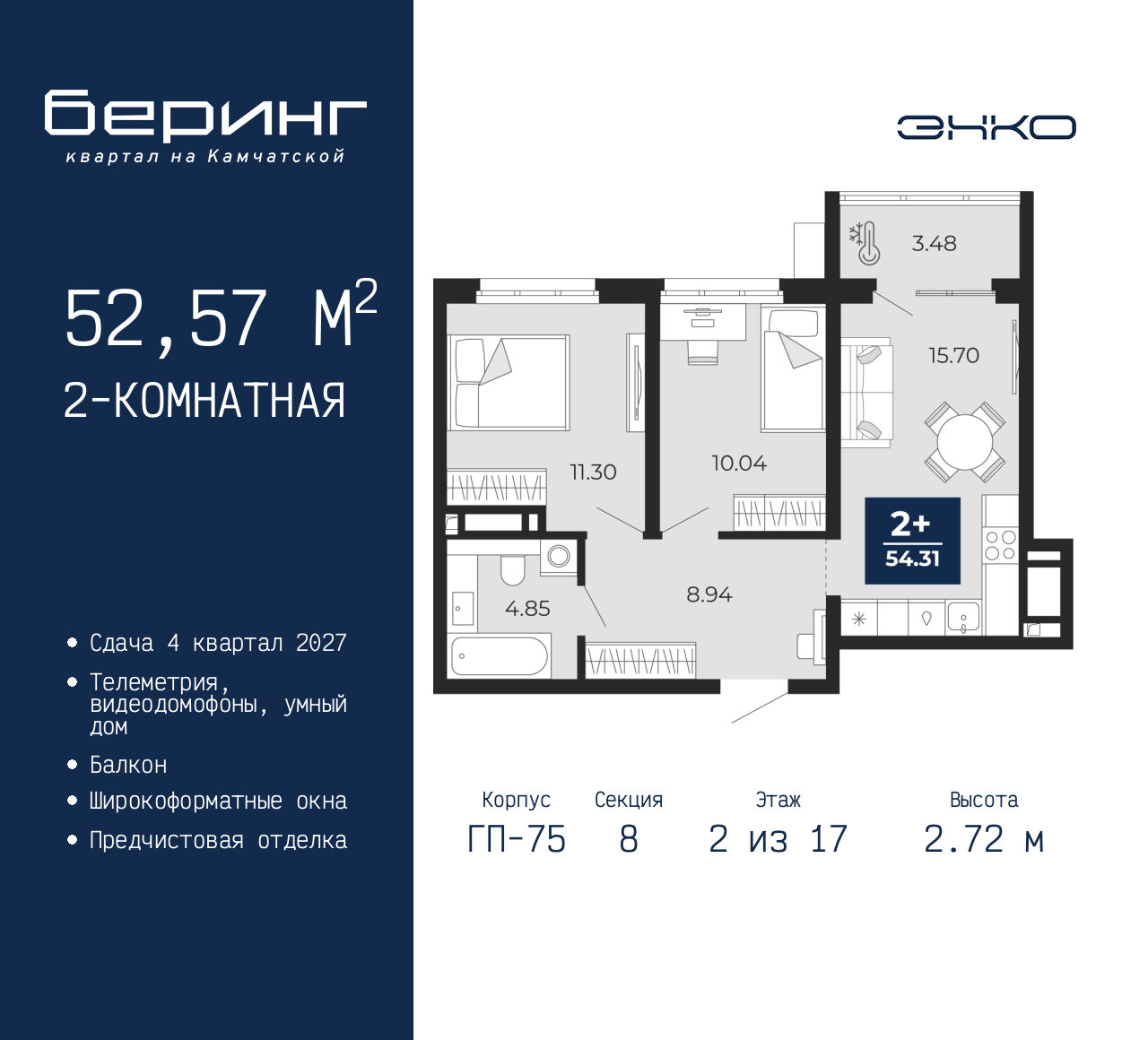2-комн. квартира с предчистовой отделкой в ЖК "Беринг" на 2 этаже. Общая площадь: 52.57 кв.м., жилая: 21.34 кв.м., площадь просторной кухни-столовой: 15.7 кв.м. Комнаты изолированные, все окна выходят на одну сторону. В квартире один балкон, один совмещенный санузел. Высота потолков 2.72 м. Дом монолитный, многоподъездный, переменной этажности, от 17 до 24 этажей. Квартира находится в 8-й секции высотой 17 этажей в корпусе ГП-75. На этаже 8 квартир. В подъезде 2 пассажирских и 1 грузовой лифт. Окончание строительства - 4 квартал 2027 года. Оформление сделки по договору долевого участия. Подобно знаменитому исследователю, мы чувствуем себя первооткрывателями этой локации. Хотим показать новую суть места, сформировать для вас жизненный опыт, которого ещё не было. Беринг — район зелёного цвета. Беринг — район, который откроется вам с другой стороны. Впечатлит новым уровнем комфорта и качеством жизни. Беринг — открытие на карте города. Первый квартал расположен в районе Тура, в границах улиц: Камчатская – Западносибирская – Энтузиастов. Вокруг уже есть всё для того, чтобы ежедневная рутина была лишь частью жизни и не доставляла дискомфорта. Школы и детские сады, магазины и аптеки, поликлиника, места для семейного отдыха, пеших и велопрогулок, и даже рыбалки. Масштабное озеленение дворов — визитная карточка ЭНКО и ваш оазис спокойствия, чтобы отвлечься от повседневности. Раскидистые деревья, кустарники, травы и цветы — осталось остановиться, вдохнуть и расслабиться, глядя на эту природную красоту. Стилистика подъездов продолжает концепцию Беринга, вдохновлённого Камчаткой: сдержанный, но при этом впечатляющий дизайн соседствует с удобством и функциональностью. (AQID02529653)