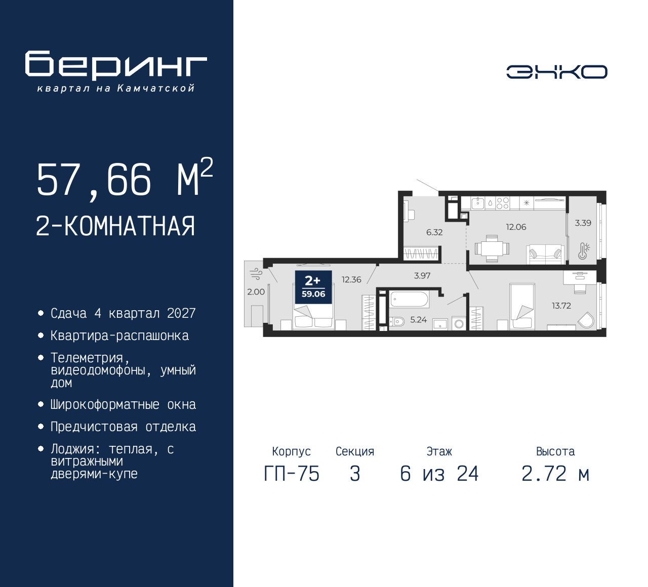 Просторная 2-комн. квартира с предчистовой отделкой в ЖК "Беринг" на 6 этаже. Общая площадь: 57.66 кв.м., жилая: 26.08 кв.м., площадь просторной кухни-столовой: 12.06 кв.м. Квартира - распашонка, без проходных комнат, окна выходят на paзные стороны дома. В квартире один балкон и одна лоджия, один совмещенный санузел. Высота потолков 2.72 м. Дом монолитный, многоподъездный, переменной этажности, от 17 до 24 этажей. Квартира находится в 3-й секции высотой 24 этажа в корпусе ГП-75. На этаже 6 квартир. В подъезде 2 пассажирских и 1 грузовой лифт. Окончание строительства - 4 квартал 2027 года. Оформление сделки по договору долевого участия. Подобно знаменитому исследователю, мы чувствуем себя первооткрывателями этой локации. Хотим показать новую суть места, сформировать для вас жизненный опыт, которого ещё не было. Беринг — район зелёного цвета. Беринг — район, который откроется вам с другой стороны. Впечатлит новым уровнем комфорта и качеством жизни. Беринг — открытие на карте города. Первый квартал расположен в районе Тура, в границах улиц: Камчатская – Западносибирская – Энтузиастов. Вокруг уже есть всё для того, чтобы ежедневная рутина была лишь частью жизни и не доставляла дискомфорта. Школы и детские сады, магазины и аптеки, поликлиника, места для семейного отдыха, пеших и велопрогулок, и даже рыбалки. Масштабное озеленение дворов — визитная карточка ЭНКО и ваш оазис спокойствия, чтобы отвлечься от повседневности. Раскидистые деревья, кустарники, травы и цветы — осталось остановиться, вдохнуть и расслабиться, глядя на эту природную красоту. Стилистика подъездов продолжает концепцию Беринга, вдохновлённого Камчаткой: сдержанный, но при этом впечатляющий дизайн соседствует с удобством и функциональностью. (AQID02529695)
