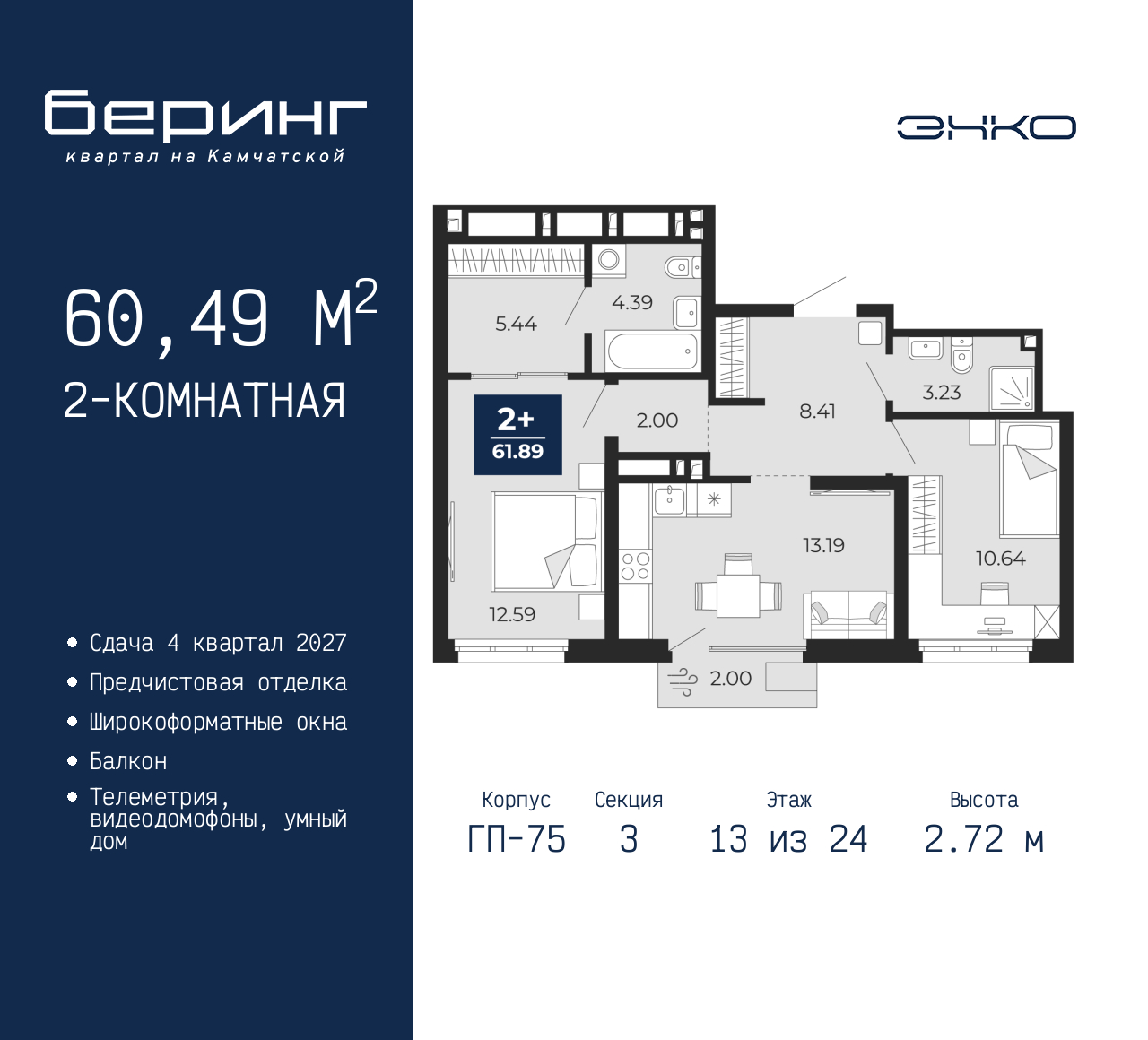 Продается 2-комн. квартира с предчистовой отделкой в ЖК "Беринг" на 13 этаже. Общая площадь: 60.49 кв.м., жилая: 23.23 кв.м., площадь просторной кухни-столовой: 13.19 кв.м. Комнаты изолированные, все окна выходят на одну сторону. В квартире один балкон, два совмещенных санузла. Высота потолков 2.72 м. Дом монолитный, многоподъездный, переменной этажности, от 17 до 24 этажей. Квартира находится в 3-й секции высотой 24 этажа в корпусе ГП-75. На этаже 6 квартир. В подъезде 2 пассажирских и 1 грузовой лифт. Окончание строительства - 4 квартал 2027 года. Оформление сделки по договору долевого участия. Подобно знаменитому исследователю, мы чувствуем себя первооткрывателями этой локации. Хотим показать новую суть места, сформировать для вас жизненный опыт, которого ещё не было. Беринг — район зелёного цвета. Беринг — район, который откроется вам с другой стороны. Впечатлит новым уровнем комфорта и качеством жизни. Беринг — открытие на карте города. Первый квартал расположен в районе Тура, в границах улиц: Камчатская – Западносибирская – Энтузиастов. Вокруг уже есть всё для того, чтобы ежедневная рутина была лишь частью жизни и не доставляла дискомфорта. Школы и детские сады, магазины и аптеки, поликлиника, места для семейного отдыха, пеших и велопрогулок, и даже рыбалки. Масштабное озеленение дворов — визитная карточка ЭНКО и ваш оазис спокойствия, чтобы отвлечься от повседневности. Раскидистые деревья, кустарники, травы и цветы — осталось остановиться, вдохнуть и расслабиться, глядя на эту природную красоту. Стилистика подъездов продолжает концепцию Беринга, вдохновлённого Камчаткой: сдержанный, но при этом впечатляющий дизайн соседствует с удобством и функциональностью. (AQID02529730)