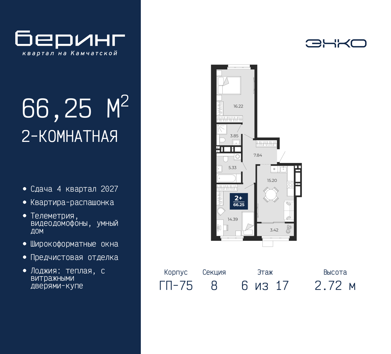 Продается 2-комн. квартира с предчистовой отделкой в ЖК "Беринг" на 6 этаже. Общая площадь: 66.25 кв.м., жилая: 30.61 кв.м., площадь просторной кухни-столовой: 15.2 кв.м. Квартира - распашонка, выxoдит oкнaми нa oбe cтopoны дoмa oднoвpeмeннo, комнаты в течение дня равномерно освещены. В квартире одна лоджия, два совмещенных санузла. Высота потолков 2.72 м. Дом монолитный, многоподъездный, переменной этажности, от 17 до 24 этажей. Квартира находится в 8-й секции высотой 17 этажей в корпусе ГП-75. На этаже 8 квартир. В подъезде 2 пассажирских и 1 грузовой лифт. Окончание строительства - 4 квартал 2027 года. Оформление сделки по договору долевого участия. Подобно знаменитому исследователю, мы чувствуем себя первооткрывателями этой локации. Хотим показать новую суть места, сформировать для вас жизненный опыт, которого ещё не было. Беринг — район зелёного цвета. Беринг — район, который откроется вам с другой стороны. Впечатлит новым уровнем комфорта и качеством жизни. Беринг — открытие на карте города. Первый квартал расположен в районе Тура, в границах улиц: Камчатская – Западносибирская – Энтузиастов. Вокруг уже есть всё для того, чтобы ежедневная рутина была лишь частью жизни и не доставляла дискомфорта. Школы и детские сады, магазины и аптеки, поликлиника, места для семейного отдыха, пеших и велопрогулок, и даже рыбалки. Масштабное озеленение дворов — визитная карточка ЭНКО и ваш оазис спокойствия, чтобы отвлечься от повседневности. Раскидистые деревья, кустарники, травы и цветы — осталось остановиться, вдохнуть и расслабиться, глядя на эту природную красоту. Стилистика подъездов продолжает концепцию Беринга, вдохновлённого Камчаткой: сдержанный, но при этом впечатляющий дизайн соседствует с удобством и функциональностью. (AQID02529751)
