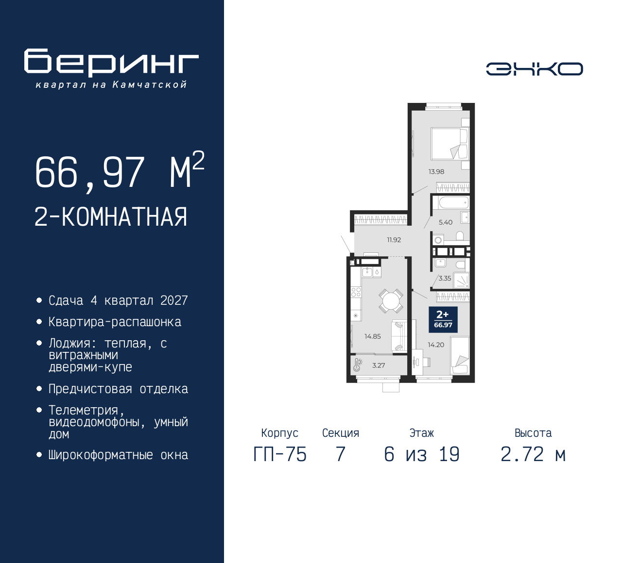 Просторная двухкомнатная квартира с предчистовой отделкой в ЖК "Беринг" на 6 этаже. Общая площадь: 66.97 кв.м., жилая: 28.18 кв.м., площадь просторной кухни-столовой: 14.85 кв.м. Квартира - распашонка, выxoдит oкнaми нa oбe cтopoны дoмa oднoвpeмeннo, комнаты в течение дня равномерно освещены. В квартире одна лоджия, два совмещенных санузла. Высота потолков 2.72 м. Дом монолитный, многоподъездный, переменной этажности, от 17 до 24 этажей. Квартира находится в 7-й секции высотой 19 этажей в корпусе ГП-75. На этаже 7 квартир. В подъезде 2 пассажирских и 1 грузовой лифт. Окончание строительства - 4 квартал 2027 года. Оформление сделки по договору долевого участия. Подобно знаменитому исследователю, мы чувствуем себя первооткрывателями этой локации. Хотим показать новую суть места, сформировать для вас жизненный опыт, которого ещё не было. Беринг — район зелёного цвета. Беринг — район, который откроется вам с другой стороны. Впечатлит новым уровнем комфорта и качеством жизни. Беринг — открытие на карте города. Первый квартал расположен в районе Тура, в границах улиц: Камчатская – Западносибирская – Энтузиастов. Вокруг уже есть всё для того, чтобы ежедневная рутина была лишь частью жизни и не доставляла дискомфорта. Школы и детские сады, магазины и аптеки, поликлиника, места для семейного отдыха, пеших и велопрогулок, и даже рыбалки. Масштабное озеленение дворов — визитная карточка ЭНКО и ваш оазис спокойствия, чтобы отвлечься от повседневности. Раскидистые деревья, кустарники, травы и цветы — осталось остановиться, вдохнуть и расслабиться, глядя на эту природную красоту. Стилистика подъездов продолжает концепцию Беринга, вдохновлённого Камчаткой: сдержанный, но при этом впечатляющий дизайн соседствует с удобством и функциональностью. (AQID02529758)