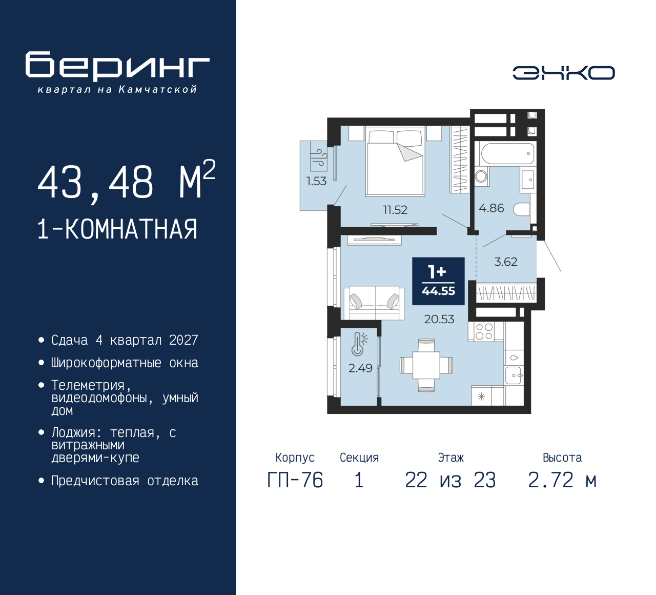 Продается однокомнатная квартира с предчистовой отделкой в ЖК "Беринг" на 22 этаже. Общая площадь: 43.48 кв.м., жилая: 11.52 кв.м., площадь просторной кухни-столовой: 20.53 кв.м. Все окна выходят на одну сторону. В квартире один балкон и одна лоджия, один совмещенный санузел. Высота потолков 2.72 м. Дом монолитный, черырехподъездный, переменной этажности, от 19 до 24 этажей. Квартира находится в 1-й секции высотой 23 этажа в корпусе ГП-76. На этаже 7 квартир. В подъезде 2 пассажирских и 1 грузовой лифт. Окончание строительства - 4 квартал 2027 года. Оформление сделки по договору долевого участия. Подобно знаменитому исследователю, мы чувствуем себя первооткрывателями этой локации. Хотим показать новую суть места, сформировать для вас жизненный опыт, которого ещё не было. Беринг — район зелёного цвета. Беринг — район, который откроется вам с другой стороны. Впечатлит новым уровнем комфорта и качеством жизни. Беринг — открытие на карте города. Первый квартал расположен в районе Тура, в границах улиц: Камчатская – Западносибирская – Энтузиастов. Вокруг уже есть всё для того, чтобы ежедневная рутина была лишь частью жизни и не доставляла дискомфорта. Школы и детские сады, магазины и аптеки, поликлиника, места для семейного отдыха, пеших и велопрогулок, и даже рыбалки. Масштабное озеленение дворов — визитная карточка ЭНКО и ваш оазис спокойствия, чтобы отвлечься от повседневности. Раскидистые деревья, кустарники, травы и цветы — осталось остановиться, вдохнуть и расслабиться, глядя на эту природную красоту. Стилистика подъездов продолжает концепцию Беринга, вдохновлённого Камчаткой: сдержанный, но при этом впечатляющий дизайн соседствует с удобством и функциональностью. (AQID02517936)