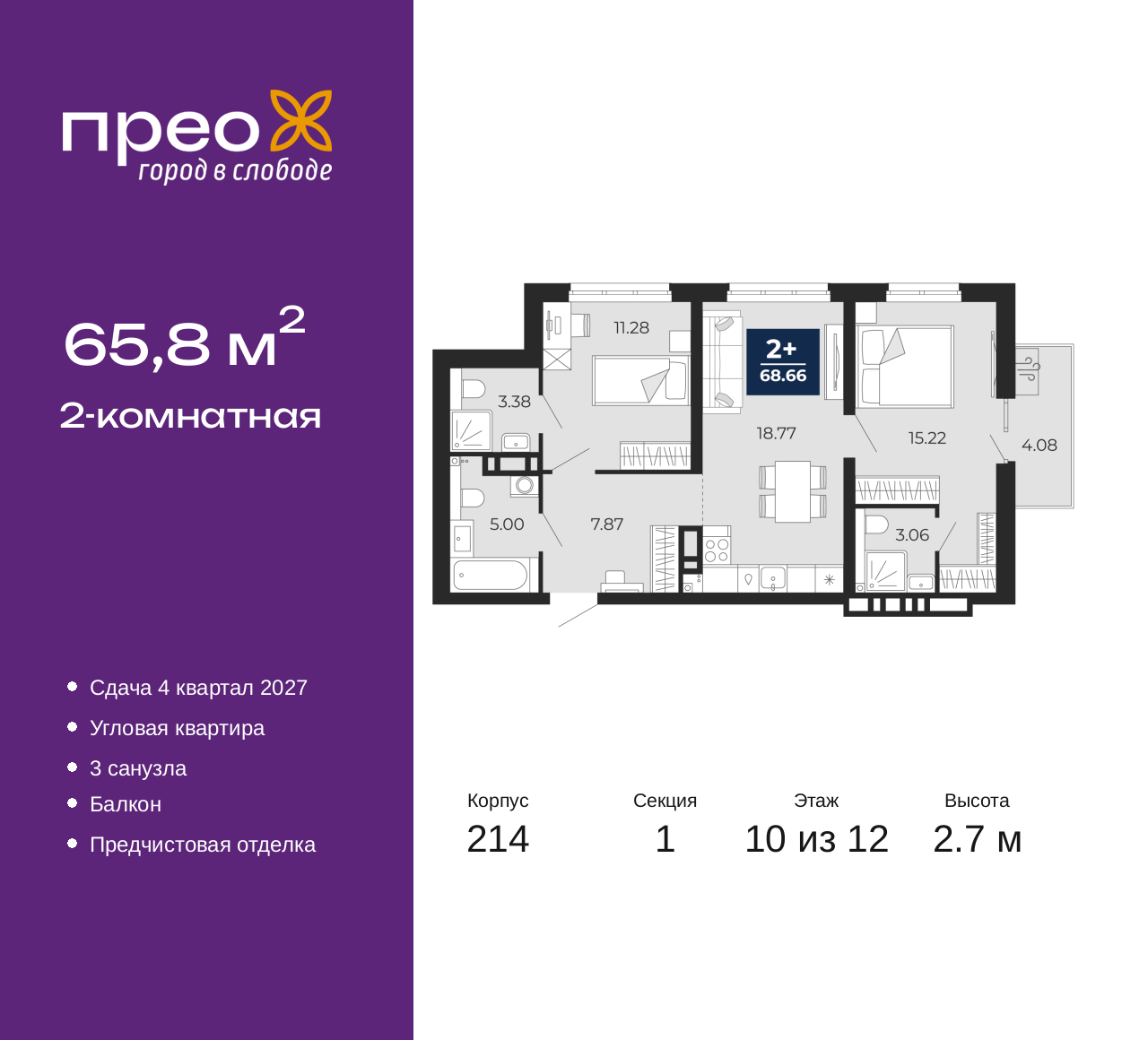 Просторная двухкомнатная квартира с предчистовой отделкой в ЖК "Прео" на 10 этаже. Общая площадь: 65.8 кв.м., жилая: 26.5 кв.м., площадь просторной кухни-столовой: 18.77 кв.м. Квартира угловая, очень светлая, естественная вентиляция при открытии окон. В квартире один балкон, три совмещенных санузла. Высота потолков 2.7 м. Дом монолитный, двухподъездный, переменной этажности, от 12 до 20 этажей. Квартира находится в 1-й секции высотой 12 этажей в корпусе 214. На этаже 8 квартир. В подъезде 1 пассажирский и 1 грузовой лифт. Окончание строительства - 4 квартал 2027 года. Оформление сделки по договору долевого участия. Преображенский — один из самых привлекательных районов для жизни! Это полностью самостоятельный жилой район с точки зрения инфраструктуры. Преображенский находится между Московским и Червишевским трактами в квартале улиц Закалужская — Вьюжная — Александра Протозанова. Не нужно ждать, когда появится инфраструктура — переезжайте на всё готовое. Вблизи расположены действующие школа и детский сад. В этом году откроется еще один сад, а в следующем году — школа. По соседству с Преображенским запланировано строительство городского парка «Комарово» площадью 38 гектар. За 10 минут можно доехать на автомобиле до крупных ТРЦ: «Лента», «Кристалл», «Леруа Мерлен», «Метро» и «Ашан». С 2018 года в районе открыт Соседский центр — пространство, созданное для формирования добрососедской среды, совместного досуга, общения и реализации соседских инициатив. Здесь проходят встречи соседей, а также сами жители района организовывают мероприятия. Организатором такого события может стать любой желающий. В квартирах выполнена качественная предчистовая отделка. Гладкие стены с финишным выравниванием по маякам. Ровный потолок для установки натяжного потолка. Установлены пятикамерные окна с двойным стеклопакетом (3 стекла). Дизайнерские холлы с видеонаблюдением, безбарьерным и прозрачным входом – всегда светло и спокойно. На первом этаже есть просторные колясочные, где все жители могут оставлять свои коляски и велосипеды. В Преображенском есть всё, что нужно для активного отдыха и занятий спортом. Мы сделали большое футбольное поле с безопасным покрытием. Также установили хоккейный корт, который оборудован по всем необходимым стандартам. Во дворах можно делать упражнения на специальных площадках с турниками. Весь район мы обустроили велодорожками, которые связаны в единый маршрут. У нас есть сухие фонтаны, бьющие из земли, деревья, веревки, сетки, скалодром, газон, песок и резинка — осталось просто дать своему ребенку право на свободную игру. По-настоящему хорошие дворы — это те, которые дети предпочитают соцсетям и телевизору. Аккредитация в банках: ПАО Банк «ВТБ», ПАО «Банк Уралсиб», ПАО «Газпромбанк», ОАО «Альфа-Банк», «Сбербанк России» и других. (AQID02525608)