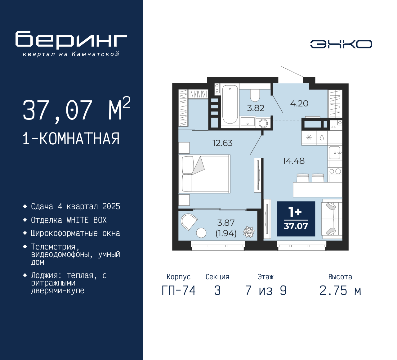 Однокомнатная квартира в ЖК "Беринг" на 7 этаже. Квартира без отделки, полностью готова к ремонту. Общая площадь: 37.07 кв.м., жилая: 12.63 кв.м., площадь просторной кухни-столовой: 14.48 кв.м. Все окна выходят на одну сторону. В квартире одна лоджия, один совмещенный санузел. Высота потолков 2.75 м. Дом монолитный, многоподъездный, переменной этажности, от 9 до 21 этажей. Квартира находится в 3-й секции высотой 9 этажей в корпусе ГП-74. На этаже 7 квартир. В подъезде 1 грузовой лифт. Окончание строительства - 4 квартал 2025 года. Оформление сделки по договору долевого участия. Подобно знаменитому исследователю, мы чувствуем себя первооткрывателями этой локации. Хотим показать новую суть места, сформировать для вас жизненный опыт, которого ещё не было. Беринг — район зелёного цвета. Беринг — район, который откроется вам с другой стороны. Впечатлит новым уровнем комфорта и качеством жизни. Беринг — открытие на карте города. Первый квартал расположен в районе Тура, в границах улиц: Камчатская – Западносибирская – Энтузиастов. Вокруг уже есть всё для того, чтобы ежедневная рутина была лишь частью жизни и не доставляла дискомфорта. Школы и детские сады, магазины и аптеки, поликлиника, места для семейного отдыха, пеших и велопрогулок, и даже рыбалки. Масштабное озеленение дворов — визитная карточка ЭНКО и ваш оазис спокойствия, чтобы отвлечься от повседневности. Раскидистые деревья, кустарники, травы и цветы — осталось остановиться, вдохнуть и расслабиться, глядя на эту природную красоту. Стилистика подъездов продолжает концепцию Беринга, вдохновлённого Камчаткой: сдержанный, но при этом впечатляющий дизайн соседствует с удобством и функциональностью. (AQID02528135)
