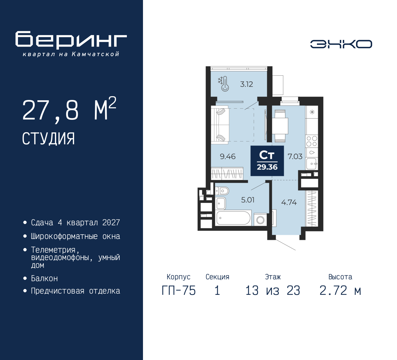 Продается однокомнатная квартира-студия от застройщика с предчистовой отделкой в ЖК "Беринг" на 13 этаже. Общая площадь: 27.8 кв.м., площадь гостиной 16.49 кв.м., из которых 7.03 кв.м. выделено под кухонную зону. Все окна выходят на одну сторону. В квартире один балкон, один совмещенный санузел. Высота потолков 2.72 м. Дом монолитный, многоподъездный, переменной этажности, от 17 до 24 этажей. Квартира находится в 1-й секции высотой 23 этажа в корпусе ГП-75. На этаже 8 квартир. В подъезде 2 пассажирских и 1 грузовой лифт. Окончание строительства - 4 квартал 2027 года. Оформление сделки по договору долевого участия. Подобно знаменитому исследователю, мы чувствуем себя первооткрывателями этой локации. Хотим показать новую суть места, сформировать для вас жизненный опыт, которого ещё не было. Беринг — район зелёного цвета. Беринг — район, который откроется вам с другой стороны. Впечатлит новым уровнем комфорта и качеством жизни. Беринг — открытие на карте города. Первый квартал расположен в районе Тура, в границах улиц: Камчатская – Западносибирская – Энтузиастов. Вокруг уже есть всё для того, чтобы ежедневная рутина была лишь частью жизни и не доставляла дискомфорта. Школы и детские сады, магазины и аптеки, поликлиника, места для семейного отдыха, пеших и велопрогулок, и даже рыбалки. Масштабное озеленение дворов — визитная карточка ЭНКО и ваш оазис спокойствия, чтобы отвлечься от повседневности. Раскидистые деревья, кустарники, травы и цветы — осталось остановиться, вдохнуть и расслабиться, глядя на эту природную красоту. Стилистика подъездов продолжает концепцию Беринга, вдохновлённого Камчаткой: сдержанный, но при этом впечатляющий дизайн соседствует с удобством и функциональностью. (AQID02529535)