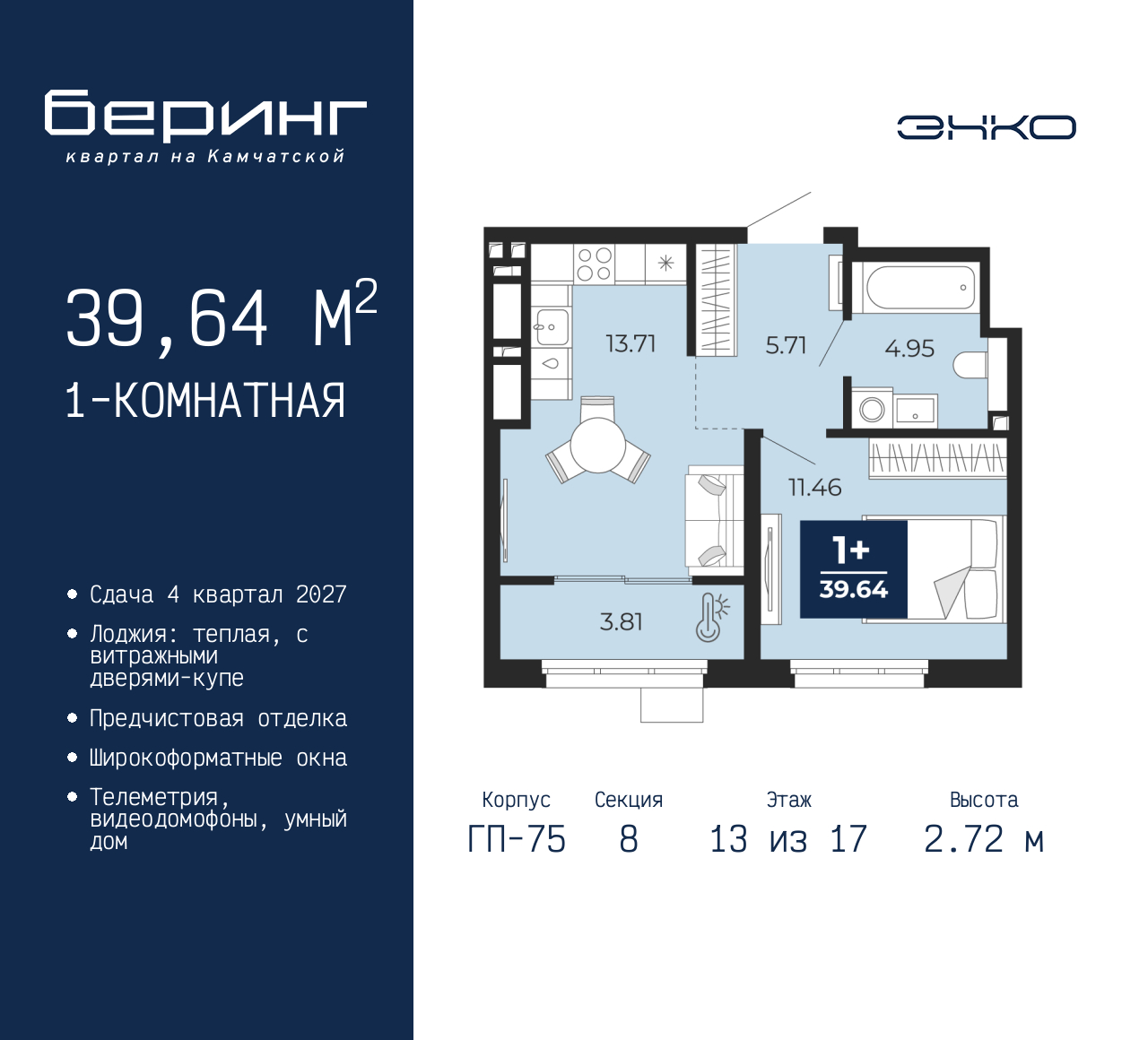 Однокомнатная квартира от застройщика с предчистовой отделкой в ЖК "Беринг" на 13 этаже. Общая площадь: 39.64 кв.м., жилая: 11.46 кв.м., площадь просторной кухни-столовой: 13.71 кв.м. Все окна выходят на одну сторону. В квартире одна лоджия, один совмещенный санузел. Высота потолков 2.72 м. Дом монолитный, многоподъездный, переменной этажности, от 17 до 24 этажей. Квартира находится в 8-й секции высотой 17 этажей в корпусе ГП-75. На этаже 8 квартир. В подъезде 2 пассажирских и 1 грузовой лифт. Окончание строительства - 4 квартал 2027 года. Оформление сделки по договору долевого участия. Подобно знаменитому исследователю, мы чувствуем себя первооткрывателями этой локации. Хотим показать новую суть места, сформировать для вас жизненный опыт, которого ещё не было. Беринг — район зелёного цвета. Беринг — район, который откроется вам с другой стороны. Впечатлит новым уровнем комфорта и качеством жизни. Беринг — открытие на карте города. Первый квартал расположен в районе Тура, в границах улиц: Камчатская – Западносибирская – Энтузиастов. Вокруг уже есть всё для того, чтобы ежедневная рутина была лишь частью жизни и не доставляла дискомфорта. Школы и детские сады, магазины и аптеки, поликлиника, места для семейного отдыха, пеших и велопрогулок, и даже рыбалки. Масштабное озеленение дворов — визитная карточка ЭНКО и ваш оазис спокойствия, чтобы отвлечься от повседневности. Раскидистые деревья, кустарники, травы и цветы — осталось остановиться, вдохнуть и расслабиться, глядя на эту природную красоту. Стилистика подъездов продолжает концепцию Беринга, вдохновлённого Камчаткой: сдержанный, но при этом впечатляющий дизайн соседствует с удобством и функциональностью. (AQID02529598)