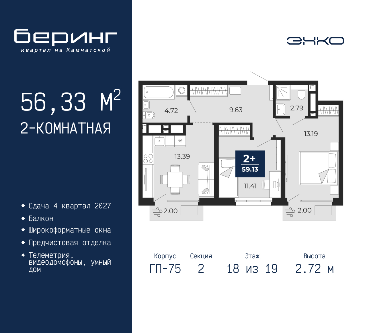 Продается 2-комн. квартира с предчистовой отделкой в ЖК "Беринг" на 18 этаже. Общая площадь: 56.33 кв.м., жилая: 24.6 кв.м., площадь просторной кухни-столовой: 13.39 кв.м. Комнаты изолированные, все окна выходят на одну сторону. В квартире два балкона, два совмещенных санузла. Высота потолков 2.72 м. Дом монолитный, многоподъездный, переменной этажности, от 17 до 24 этажей. Квартира находится во 2-й секции высотой 19 этажей в корпусе ГП-75. На этаже 7 квартир. В подъезде 2 пассажирских и 1 грузовой лифт. Окончание строительства - 4 квартал 2027 года. Оформление сделки по договору долевого участия. Подобно знаменитому исследователю, мы чувствуем себя первооткрывателями этой локации. Хотим показать новую суть места, сформировать для вас жизненный опыт, которого ещё не было. Беринг — район зелёного цвета. Беринг — район, который откроется вам с другой стороны. Впечатлит новым уровнем комфорта и качеством жизни. Беринг — открытие на карте города. Первый квартал расположен в районе Тура, в границах улиц: Камчатская – Западносибирская – Энтузиастов. Вокруг уже есть всё для того, чтобы ежедневная рутина была лишь частью жизни и не доставляла дискомфорта. Школы и детские сады, магазины и аптеки, поликлиника, места для семейного отдыха, пеших и велопрогулок, и даже рыбалки. Масштабное озеленение дворов — визитная карточка ЭНКО и ваш оазис спокойствия, чтобы отвлечься от повседневности. Раскидистые деревья, кустарники, травы и цветы — осталось остановиться, вдохнуть и расслабиться, глядя на эту природную красоту. Стилистика подъездов продолжает концепцию Беринга, вдохновлённого Камчаткой: сдержанный, но при этом впечатляющий дизайн соседствует с удобством и функциональностью. (AQID02529703)