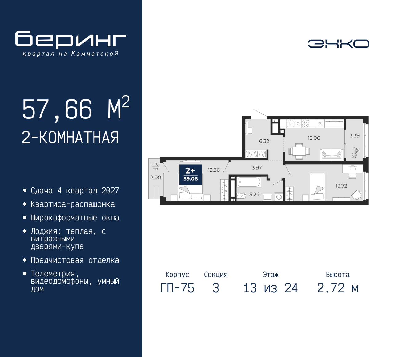 Продается 2-комн. квартира от застройщика с предчистовой отделкой в ЖК "Беринг" на 13 этаже. Общая площадь: 57.66 кв.м., жилая: 26.08 кв.м., площадь просторной кухни-столовой: 12.06 кв.м. Квартира - распашонка, без проходных комнат, окна выходят на paзные стороны дома. В квартире один балкон и одна лоджия, один совмещенный санузел. Высота потолков 2.72 м. Дом монолитный, многоподъездный, переменной этажности, от 17 до 24 этажей. Квартира находится в 3-й секции высотой 24 этажа в корпусе ГП-75. На этаже 6 квартир. В подъезде 2 пассажирских и 1 грузовой лифт. Окончание строительства - 4 квартал 2027 года. Оформление сделки по договору долевого участия. Подобно знаменитому исследователю, мы чувствуем себя первооткрывателями этой локации. Хотим показать новую суть места, сформировать для вас жизненный опыт, которого ещё не было. Беринг — район зелёного цвета. Беринг — район, который откроется вам с другой стороны. Впечатлит новым уровнем комфорта и качеством жизни. Беринг — открытие на карте города. Первый квартал расположен в районе Тура, в границах улиц: Камчатская – Западносибирская – Энтузиастов. Вокруг уже есть всё для того, чтобы ежедневная рутина была лишь частью жизни и не доставляла дискомфорта. Школы и детские сады, магазины и аптеки, поликлиника, места для семейного отдыха, пеших и велопрогулок, и даже рыбалки. Масштабное озеленение дворов — визитная карточка ЭНКО и ваш оазис спокойствия, чтобы отвлечься от повседневности. Раскидистые деревья, кустарники, травы и цветы — осталось остановиться, вдохнуть и расслабиться, глядя на эту природную красоту. Стилистика подъездов продолжает концепцию Беринга, вдохновлённого Камчаткой: сдержанный, но при этом впечатляющий дизайн соседствует с удобством и функциональностью. (AQID02529710)