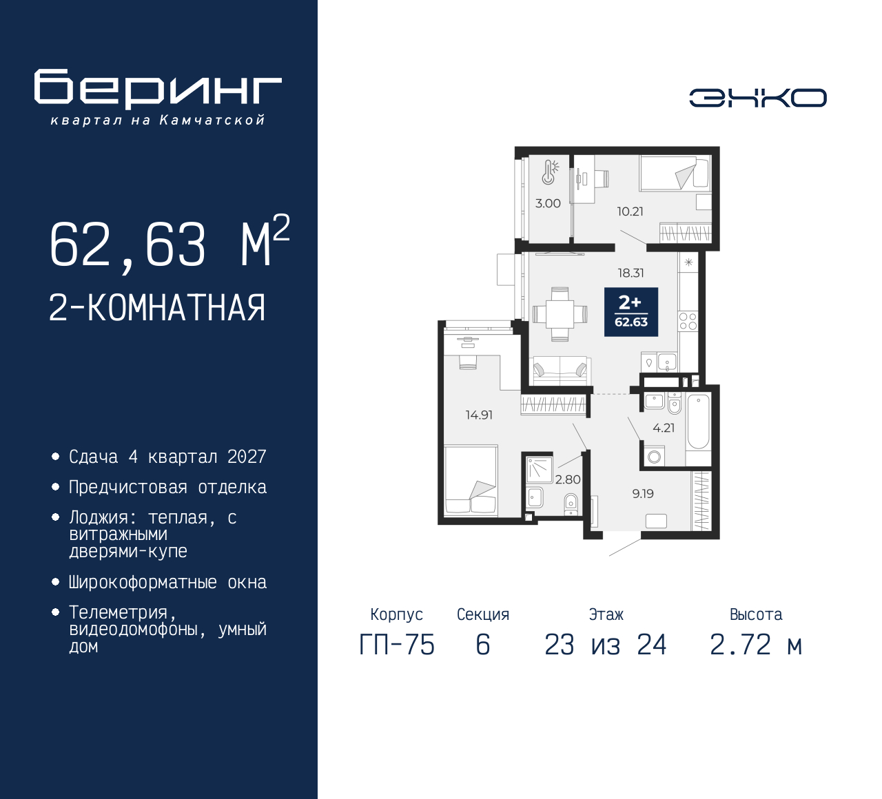 Продается 2-комн. квартира с предчистовой отделкой в ЖК "Беринг" на 23 этаже. Общая площадь: 62.63 кв.м., жилая: 25.12 кв.м., площадь просторной кухни-столовой: 18.31 кв.м. Комнаты изолированные, все окна выходят на одну сторону. В квартире одна лоджия, два совмещенных санузла. Высота потолков 2.72 м. Дом монолитный, многоподъездный, переменной этажности, от 17 до 24 этажей. Квартира находится в 6-й секции высотой 24 этажа в корпусе ГП-75. На этаже 6 квартир. В подъезде 2 пассажирских и 1 грузовой лифт. Окончание строительства - 4 квартал 2027 года. Оформление сделки по договору долевого участия. Подобно знаменитому исследователю, мы чувствуем себя первооткрывателями этой локации. Хотим показать новую суть места, сформировать для вас жизненный опыт, которого ещё не было. Беринг — район зелёного цвета. Беринг — район, который откроется вам с другой стороны. Впечатлит новым уровнем комфорта и качеством жизни. Беринг — открытие на карте города. Первый квартал расположен в районе Тура, в границах улиц: Камчатская – Западносибирская – Энтузиастов. Вокруг уже есть всё для того, чтобы ежедневная рутина была лишь частью жизни и не доставляла дискомфорта. Школы и детские сады, магазины и аптеки, поликлиника, места для семейного отдыха, пеших и велопрогулок, и даже рыбалки. Масштабное озеленение дворов — визитная карточка ЭНКО и ваш оазис спокойствия, чтобы отвлечься от повседневности. Раскидистые деревья, кустарники, травы и цветы — осталось остановиться, вдохнуть и расслабиться, глядя на эту природную красоту. Стилистика подъездов продолжает концепцию Беринга, вдохновлённого Камчаткой: сдержанный, но при этом впечатляющий дизайн соседствует с удобством и функциональностью. (AQID02529745)
