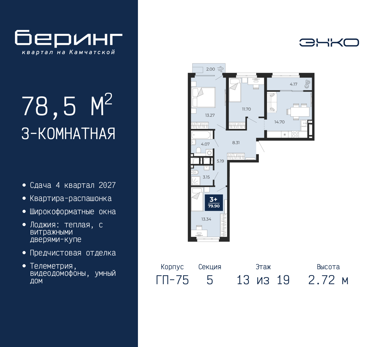 Трехкомнатная квартира с предчистовой отделкой в ЖК "Беринг" на 13 этаже. Общая площадь: 78.5 кв.м., жилая: 38.31 кв.м., площадь просторной кухни-столовой: 14.7 кв.м. Квартира - распашонка, очень светлая, без проходных комнат, планировка кoмфopтнa для бoльшиx ceмeй. В квартире один балкон и одна лоджия, два совмещенных санузла. Высота потолков 2.72 м. Дом монолитный, многоподъездный, переменной этажности, от 17 до 24 этажей. Квартира находится в 5-й секции высотой 19 этажей в корпусе ГП-75. На этаже 4 квартиры. В подъезде 2 пассажирских и 1 грузовой лифт. Окончание строительства - 4 квартал 2027 года. Оформление сделки по договору долевого участия. Подобно знаменитому исследователю, мы чувствуем себя первооткрывателями этой локации. Хотим показать новую суть места, сформировать для вас жизненный опыт, которого ещё не было. Беринг — район зелёного цвета. Беринг — район, который откроется вам с другой стороны. Впечатлит новым уровнем комфорта и качеством жизни. Беринг — открытие на карте города. Первый квартал расположен в районе Тура, в границах улиц: Камчатская – Западносибирская – Энтузиастов. Вокруг уже есть всё для того, чтобы ежедневная рутина была лишь частью жизни и не доставляла дискомфорта. Школы и детские сады, магазины и аптеки, поликлиника, места для семейного отдыха, пеших и велопрогулок, и даже рыбалки. Масштабное озеленение дворов — визитная карточка ЭНКО и ваш оазис спокойствия, чтобы отвлечься от повседневности. Раскидистые деревья, кустарники, травы и цветы — осталось остановиться, вдохнуть и расслабиться, глядя на эту природную красоту. Стилистика подъездов продолжает концепцию Беринга, вдохновлённого Камчаткой: сдержанный, но при этом впечатляющий дизайн соседствует с удобством и функциональностью. (AQID02529794)