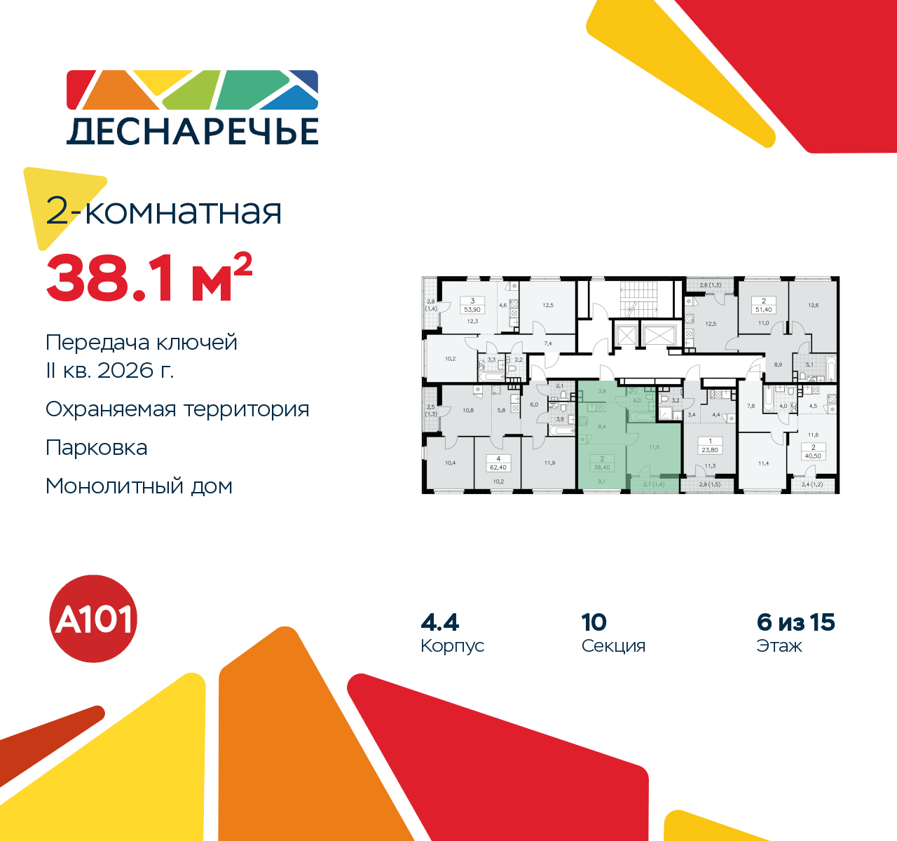 Двухкомнатная квартира с европланировкой и предчистовой отделкой в ЖК "Деснаречье" на 6 этаже. Общая площадь: 38.1 кв.м., жилая: 20.7 кв.м., суммарная площадь гостиной-столовой с кухонной зоной: 17.5 кв.м. Европейская планировка, за счет большой площади кухни-гостиной квартира выглядит просторной и очень удобна для жизни. Комнаты изолированные, все окна выходят на одну сторону. В квартире одна лоджия, один совмещенный санузел. Высота потолков 2.99 м. Эта квартира будет сдана с предчистовой отделкой white box – это квартира с ровными белыми стенами. Такая отделка позволяет сразу приступить к чистовой отделке: выбрать цвета и материалы для стен и полов, купить и расставить мебель и оборудование, развесить светильники и подобрать декор. При желании вы можете дозаказать дизайнерскую отделку от застройщика, на ваш выбор представлено несколько вариантов стилистических решений. Дом монолитный, черырехподъездный, высотой 15 этажей. Квартира находится в 1-й секции в корпусе 4.4. На этаже 6 квартир. В подъезде 1 пассажирский и 1 грузовой лифт. Начало строительства - 3 квартал 2023 года. Окончание строительства - 2 квартал 2026 года. Оформление сделки по договору долевого участия. Артикул квартиры по базе застройщика 88К-4.4-750. ПРЕДЛОЖЕНИЯ ОТ ЗАСТРОЙЩИКА В ОКТЯБРЕ 2025: Ипотека от 13,9 % для всех! На весь срок. "Семейная ипотека" вернулась. Ставка от 3,5 % на весь срок! Без удорожания! Выгодное ипотечное комбо: Ипотека от 2200 р./мес. и от 6 % после рождения ребёнка! Ипотека для всех "Держи пять!" - ставка 5 % на 2 года! *более подробную информацию по скидкам и акциям уточняйте в отделе продаж Масштабный проект "Деснаречье" на юго-западе Москвы, который включает три новых района («квартала»), объединённые общей идеей – воплотить в реальность мечты современных жителей столицы об интересном, комфортном и разноплановом городском пространстве в окружении рек и лесов, словно сошедших с полотен русских живописцев: - «Берег» оценят все, кому близка водная стихия: плеск волн, солнечные блики и прогулки вдоль тихого течения речи. - «Лес» утопает в зелени парков и лесов. Здесь соблюдён идеальный баланс загородного спокойствия и столичного комфорта. - «Парк», самый энергичный и яркий, отличается высокой концентрацией пространств для спорта и творчества. Жилой комплекс "Деснаречье" расположится в 12 км от МКАД по современному Калужскому шоссе. Внешний облик зданий соответствует современному стилю и стандартам, характерным и для других популярных проектов ГК «А101»: сочетание контрастных тонов, большое количество остекления, в котором отражается небо, гармония с природным окружением. Весь город - в вашем районе. Находиться на территории «15-минутного города» значит иметь всё необходимое для полноценной жизни в шаговой доступности. Маршруты в районе «Деснаречье» выстроены так, чтобы добраться до магазинов, парков, школ, салонов услуг и других объектов можно было всего за несколько минут пешком или на велосипеде. Двор закрытый от машин – это тишина, комфорт и безопасность, поэтому все машино-места (включая «семейные» и увеличенные, с возможностью установки роллетных шкафов) находятся в подземном паркинге. В паркинги можно спуститься на лифте из любого подъезда или по лестнице. Рядом с «Деснаречьем» в 2027 году планируется открытие станции метро «Десна», до которой будет удобно добраться пешком или 