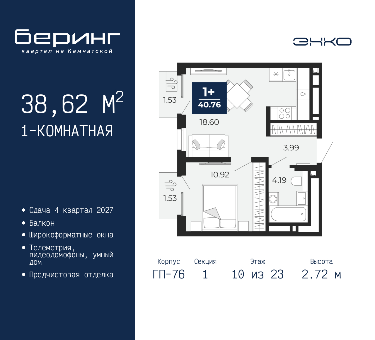 1-комн. квартира с предчистовой отделкой в ЖК "Беринг" на 10 этаже. Общая площадь: 38.62 кв.м., жилая: 10.92 кв.м., площадь просторной кухни-столовой: 18.6 кв.м. Все окна выходят на одну сторону. В квартире два балкона, один совмещенный санузел. Высота потолков 2.72 м. Дом монолитный, черырехподъездный, переменной этажности, от 19 до 24 этажей. Квартира находится в 1-й секции высотой 23 этажа в корпусе ГП-76. На этаже 7 квартир. В подъезде 2 пассажирских и 1 грузовой лифт. Окончание строительства - 4 квартал 2027 года. Оформление сделки по договору долевого участия. Подобно знаменитому исследователю, мы чувствуем себя первооткрывателями этой локации. Хотим показать новую суть места, сформировать для вас жизненный опыт, которого ещё не было. Беринг — район зелёного цвета. Беринг — район, который откроется вам с другой стороны. Впечатлит новым уровнем комфорта и качеством жизни. Беринг — открытие на карте города. Первый квартал расположен в районе Тура, в границах улиц: Камчатская – Западносибирская – Энтузиастов. Вокруг уже есть всё для того, чтобы ежедневная рутина была лишь частью жизни и не доставляла дискомфорта. Школы и детские сады, магазины и аптеки, поликлиника, места для семейного отдыха, пеших и велопрогулок, и даже рыбалки. Масштабное озеленение дворов — визитная карточка ЭНКО и ваш оазис спокойствия, чтобы отвлечься от повседневности. Раскидистые деревья, кустарники, травы и цветы — осталось остановиться, вдохнуть и расслабиться, глядя на эту природную красоту. Стилистика подъездов продолжает концепцию Беринга, вдохновлённого Камчаткой: сдержанный, но при этом впечатляющий дизайн соседствует с удобством и функциональностью. (AQID02517986)
