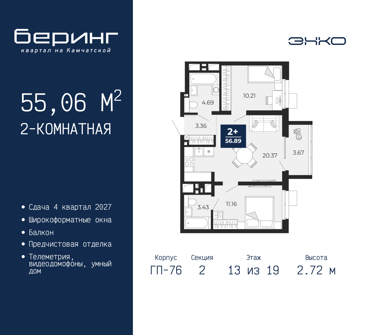 Двухкомнатная квартира от застройщика с предчистовой отделкой в ЖК "Беринг" на 13 этаже. Общая площадь: 55.06 кв.м., жилая: 21.37 кв.м., площадь просторной кухни-столовой: 20.37 кв.м. Комнаты изолированные, все окна выходят на одну сторону. В квартире один балкон, два совмещенных санузла. Высота потолков 2.72 м. Дом монолитный, черырехподъездный, переменной этажности, от 19 до 24 этажей. Квартира находится во 2-й секции высотой 19 этажей в корпусе ГП-76. На этаже 8 квартир. В подъезде 1 пассажирский и 1 грузовой лифт. Окончание строительства - 4 квартал 2027 года. Оформление сделки по договору долевого участия. Подобно знаменитому исследователю, мы чувствуем себя первооткрывателями этой локации. Хотим показать новую суть места, сформировать для вас жизненный опыт, которого ещё не было. Беринг — район зелёного цвета. Беринг — район, который откроется вам с другой стороны. Впечатлит новым уровнем комфорта и качеством жизни. Беринг — открытие на карте города. Первый квартал расположен в районе Тура, в границах улиц: Камчатская – Западносибирская – Энтузиастов. Вокруг уже есть всё для того, чтобы ежедневная рутина была лишь частью жизни и не доставляла дискомфорта. Школы и детские сады, магазины и аптеки, поликлиника, места для семейного отдыха, пеших и велопрогулок, и даже рыбалки. Масштабное озеленение дворов — визитная карточка ЭНКО и ваш оазис спокойствия, чтобы отвлечься от повседневности. Раскидистые деревья, кустарники, травы и цветы — осталось остановиться, вдохнуть и расслабиться, глядя на эту природную красоту. Стилистика подъездов продолжает концепцию Беринга, вдохновлённого Камчаткой: сдержанный, но при этом впечатляющий дизайн соседствует с удобством и функциональностью. (AQID02518147)