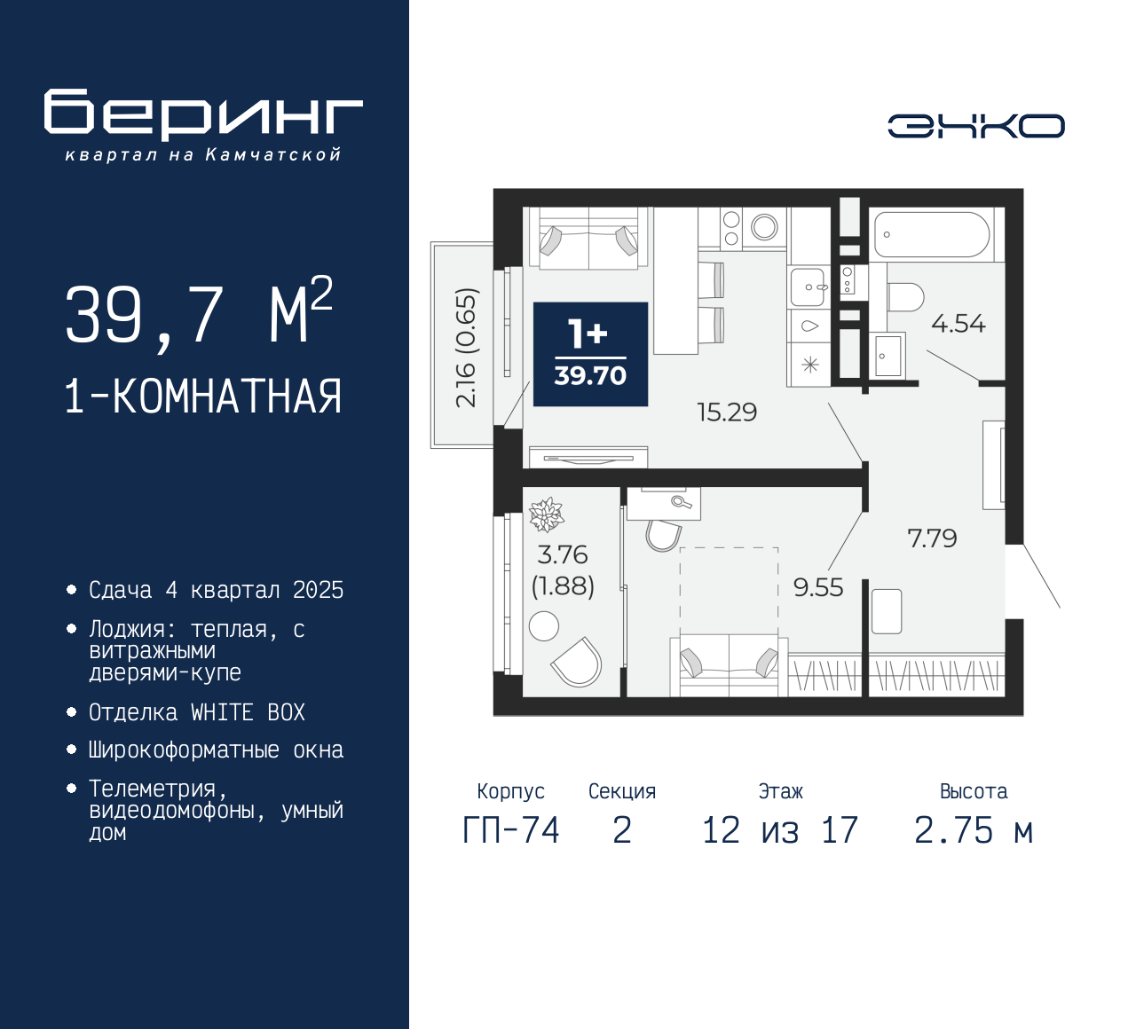 1-комн. квартира в ЖК "Беринг" на 12 этаже. Квартира без отделки, новый собственник может сделать ремонт по своему проекту. Общая площадь: 39.7 кв.м., жилая: 9.55 кв.м., площадь просторной кухни-столовой: 15.29 кв.м. Все окна выходят на одну сторону. В квартире один балкон и одна лоджия, один совмещенный санузел. Высота потолков 2.75 м. Дом монолитный, многоподъездный, переменной этажности, от 9 до 21 этажей. Квартира находится во 2-й секции высотой 17 этажей в корпусе ГП-74. На этаже 7 квартир. В подъезде 1 пассажирский и 1 грузовой лифт. Окончание строительства - 4 квартал 2025 года. Оформление сделки по договору долевого участия. Подобно знаменитому исследователю, мы чувствуем себя первооткрывателями этой локации. Хотим показать новую суть места, сформировать для вас жизненный опыт, которого ещё не было. Беринг — район зелёного цвета. Беринг — район, который откроется вам с другой стороны. Впечатлит новым уровнем комфорта и качеством жизни. Беринг — открытие на карте города. Первый квартал расположен в районе Тура, в границах улиц: Камчатская – Западносибирская – Энтузиастов. Вокруг уже есть всё для того, чтобы ежедневная рутина была лишь частью жизни и не доставляла дискомфорта. Школы и детские сады, магазины и аптеки, поликлиника, места для семейного отдыха, пеших и велопрогулок, и даже рыбалки. Масштабное озеленение дворов — визитная карточка ЭНКО и ваш оазис спокойствия, чтобы отвлечься от повседневности. Раскидистые деревья, кустарники, травы и цветы — осталось остановиться, вдохнуть и расслабиться, глядя на эту природную красоту. Стилистика подъездов продолжает концепцию Беринга, вдохновлённого Камчаткой: сдержанный, но при этом впечатляющий дизайн соседствует с удобством и функциональностью. (AQID02525455)