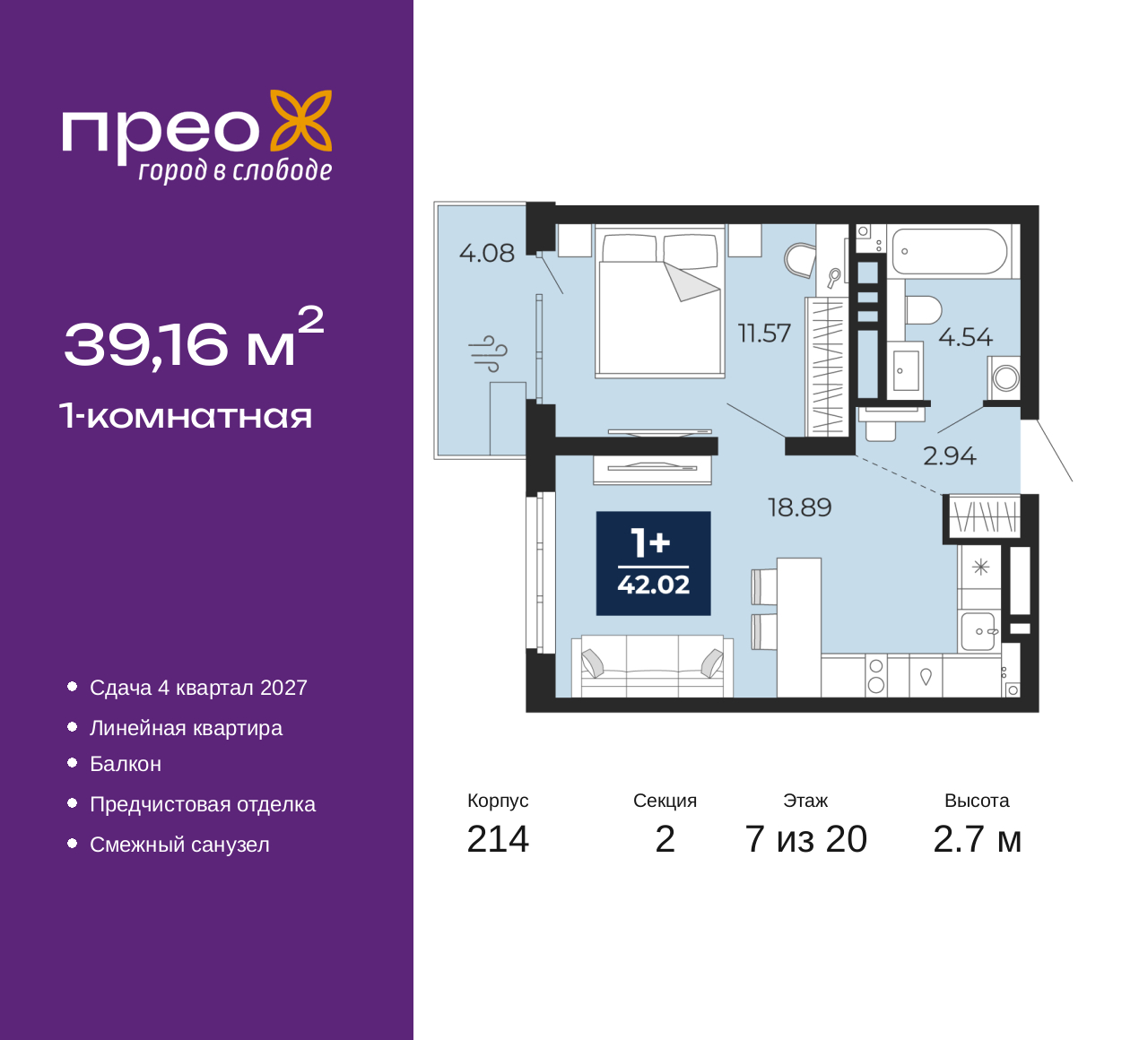 Просторная 1-комн. квартира с предчистовой отделкой в ЖК "Прео" на 7 этаже. Общая площадь: 39.16 кв.м., жилая: 11.57 кв.м., площадь просторной кухни-столовой: 18.89 кв.м. Все окна выходят на одну сторону. В квартире один балкон, один совмещенный санузел. Высота потолков 2.7 м. Дом монолитный, двухподъездный, переменной этажности, от 12 до 20 этажей. Квартира находится во 2-й секции высотой 20 этажей в корпусе 214. На этаже 8 квартир. В подъезде 1 пассажирский и 1 грузовой лифт. Окончание строительства - 4 квартал 2027 года. Оформление сделки по договору долевого участия. Преображенский — один из самых привлекательных районов для жизни! Это полностью самостоятельный жилой район с точки зрения инфраструктуры. Преображенский находится между Московским и Червишевским трактами в квартале улиц Закалужская — Вьюжная — Александра Протозанова. Не нужно ждать, когда появится инфраструктура — переезжайте на всё готовое. Вблизи расположены действующие школа и детский сад. В этом году откроется еще один сад, а в следующем году — школа. По соседству с Преображенским запланировано строительство городского парка «Комарово» площадью 38 гектар. За 10 минут можно доехать на автомобиле до крупных ТРЦ: «Лента», «Кристалл», «Леруа Мерлен», «Метро» и «Ашан». С 2018 года в районе открыт Соседский центр — пространство, созданное для формирования добрососедской среды, совместного досуга, общения и реализации соседских инициатив. Здесь проходят встречи соседей, а также сами жители района организовывают мероприятия. Организатором такого события может стать любой желающий. В квартирах выполнена качественная предчистовая отделка. Гладкие стены с финишным выравниванием по маякам. Ровный потолок для установки натяжного потолка. Установлены пятикамерные окна с двойным стеклопакетом (3 стекла). Дизайнерские холлы с видеонаблюдением, безбарьерным и прозрачным входом – всегда светло и спокойно. На первом этаже есть просторные колясочные, где все жители могут оставлять свои коляски и велосипеды. В Преображенском есть всё, что нужно для активного отдыха и занятий спортом. Мы сделали большое футбольное поле с безопасным покрытием. Также установили хоккейный корт, который оборудован по всем необходимым стандартам. Во дворах можно делать упражнения на специальных площадках с турниками. Весь район мы обустроили велодорожками, которые связаны в единый маршрут. У нас есть сухие фонтаны, бьющие из земли, деревья, веревки, сетки, скалодром, газон, песок и резинка — осталось просто дать своему ребенку право на свободную игру. По-настоящему хорошие дворы — это те, которые дети предпочитают соцсетям и телевизору. Аккредитация в банках: «Сбербанк России», ПАО Банк «ВТБ», ПАО «Газпромбанк», ПАО «Банк Уралсиб», ОАО «Альфа-Банк» и других. (AQID02525469)