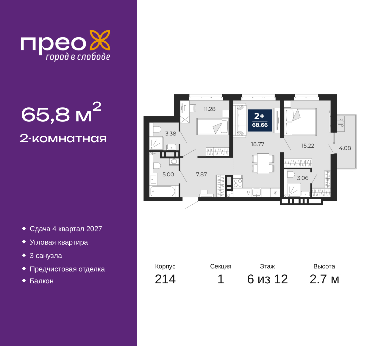 Продается 2-комн. квартира от застройщика с предчистовой отделкой в ЖК "Прео" на 6 этаже. Общая площадь: 65.8 кв.м., жилая: 26.5 кв.м., площадь просторной кухни-столовой: 18.77 кв.м. Угловая квартира, идеально подойдет любителям тишины и панорамных видов. В квартире один балкон, три совмещенных санузла. Высота потолков 2.7 м. Дом монолитный, двухподъездный, переменной этажности, от 12 до 20 этажей. Квартира находится в 1-й секции высотой 12 этажей в корпусе 214. На этаже 8 квартир. В подъезде 1 пассажирский и 1 грузовой лифт. Окончание строительства - 4 квартал 2027 года. Оформление сделки по договору долевого участия. Преображенский — один из самых привлекательных районов для жизни! Это полностью самостоятельный жилой район с точки зрения инфраструктуры. Преображенский находится между Московским и Червишевским трактами в квартале улиц Закалужская — Вьюжная — Александра Протозанова. Не нужно ждать, когда появится инфраструктура — переезжайте на всё готовое. Вблизи расположены действующие школа и детский сад. В этом году откроется еще один сад, а в следующем году — школа. По соседству с Преображенским запланировано строительство городского парка «Комарово» площадью 38 гектар. За 10 минут можно доехать на автомобиле до крупных ТРЦ: «Лента», «Кристалл», «Леруа Мерлен», «Метро» и «Ашан». С 2018 года в районе открыт Соседский центр — пространство, созданное для формирования добрососедской среды, совместного досуга, общения и реализации соседских инициатив. Здесь проходят встречи соседей, а также сами жители района организовывают мероприятия. Организатором такого события может стать любой желающий. В квартирах выполнена качественная предчистовая отделка. Гладкие стены с финишным выравниванием по маякам. Ровный потолок для установки натяжного потолка. Установлены пятикамерные окна с двойным стеклопакетом (3 стекла). Дизайнерские холлы с видеонаблюдением, безбарьерным и прозрачным входом – всегда светло и спокойно. На первом этаже есть просторные колясочные, где все жители могут оставлять свои коляски и велосипеды. В Преображенском есть всё, что нужно для активного отдыха и занятий спортом. Мы сделали большое футбольное поле с безопасным покрытием. Также установили хоккейный корт, который оборудован по всем необходимым стандартам. Во дворах можно делать упражнения на специальных площадках с турниками. Весь район мы обустроили велодорожками, которые связаны в единый маршрут. У нас есть сухие фонтаны, бьющие из земли, деревья, веревки, сетки, скалодром, газон, песок и резинка — осталось просто дать своему ребенку право на свободную игру. По-настоящему хорошие дворы — это те, которые дети предпочитают соцсетям и телевизору. Аккредитация в банках: ПАО Банк «ВТБ», ПАО «Газпромбанк», ОАО «Альфа-Банк», «Сбербанк России», ПАО «Банк Уралсиб» и других. (AQID02525602)