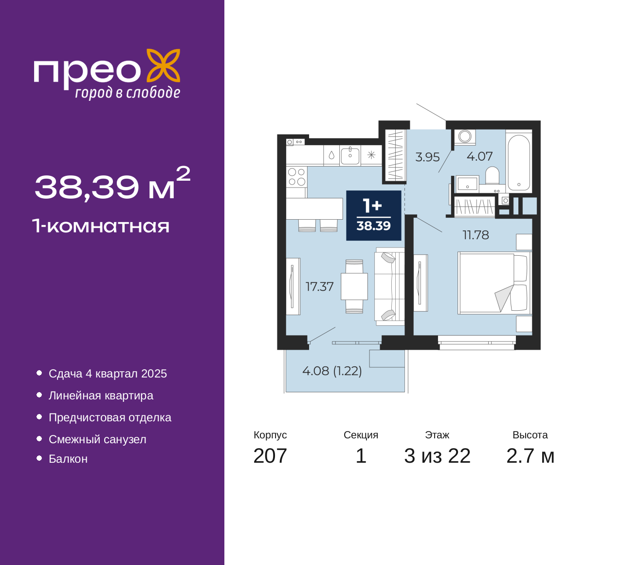 1-комн. квартира с предчистовой отделкой в ЖК "Прео" на 3 этаже. Общая площадь: 38.39 кв.м., жилая: 11.78 кв.м., площадь просторной кухни-столовой: 17.37 кв.м. Все окна выходят на одну сторону. В квартире один балкон, один совмещенный санузел. Высота потолков 2.7 м. Дом монолитный, двухподъездный, высотой 22 этажа. Квартира находится в 1-й секции в корпусе 207. На этаже 8 квартир. В подъезде 1 пассажирский и 1 грузовой лифт. Окончание строительства - 4 квартал 2025 года. Оформление сделки по договору долевого участия. Преображенский — один из самых привлекательных районов для жизни! Это полностью самостоятельный жилой район с точки зрения инфраструктуры. Преображенский находится между Московским и Червишевским трактами в квартале улиц Закалужская — Вьюжная — Александра Протозанова. Не нужно ждать, когда появится инфраструктура — переезжайте на всё готовое. Вблизи расположены действующие школа и детский сад. В этом году откроется еще один сад, а в следующем году — школа. По соседству с Преображенским запланировано строительство городского парка «Комарово» площадью 38 гектар. За 10 минут можно доехать на автомобиле до крупных ТРЦ: «Лента», «Кристалл», «Леруа Мерлен», «Метро» и «Ашан». С 2018 года в районе открыт Соседский центр — пространство, созданное для формирования добрососедской среды, совместного досуга, общения и реализации соседских инициатив. Здесь проходят встречи соседей, а также сами жители района организовывают мероприятия. Организатором такого события может стать любой желающий. В квартирах выполнена качественная предчистовая отделка. Гладкие стены с финишным выравниванием по маякам. Ровный потолок для установки натяжного потолка. Установлены пятикамерные окна с двойным стеклопакетом (3 стекла). Дизайнерские холлы с видеонаблюдением, безбарьерным и прозрачным входом – всегда светло и спокойно. На первом этаже есть просторные колясочные, где все жители могут оставлять свои коляски и велосипеды. В Преображенском есть всё, что нужно для активного отдыха и занятий спортом. Мы сделали большое футбольное поле с безопасным покрытием. Также установили хоккейный корт, который оборудован по всем необходимым стандартам. Во дворах можно делать упражнения на специальных площадках с турниками. Весь район мы обустроили велодорожками, которые связаны в единый маршрут. У нас есть сухие фонтаны, бьющие из земли, деревья, веревки, сетки, скалодром, газон, песок и резинка — осталось просто дать своему ребенку право на свободную игру. По-настоящему хорошие дворы — это те, которые дети предпочитают соцсетям и телевизору. Аккредитация в банках: ПАО «Газпромбанк», ОАО «Альфа-Банк», ПАО «Банк Уралсиб», «Сбербанк России», ПАО Банк «ВТБ» и других. (AQID02526652)