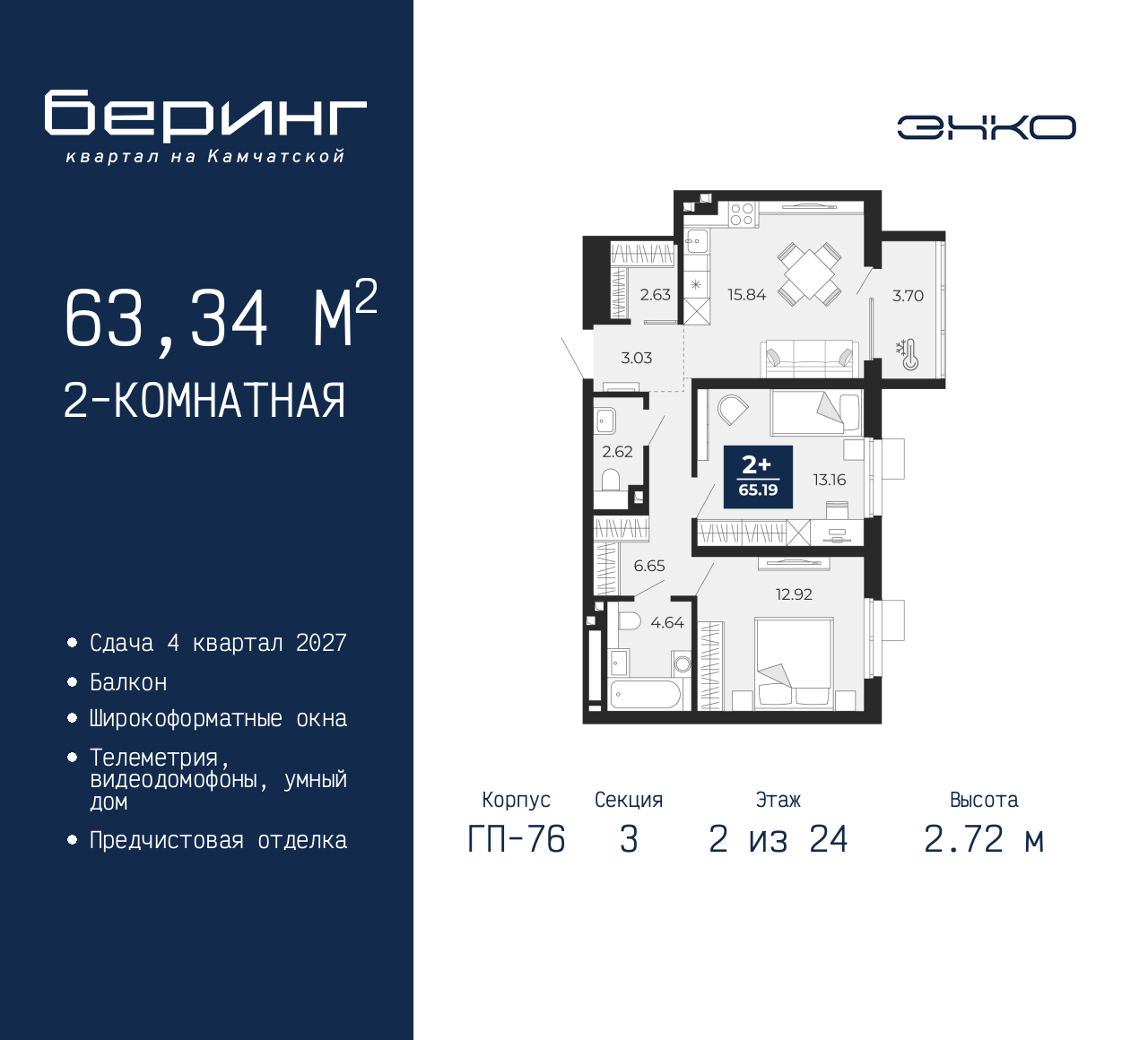2-комн. квартира с предчистовой отделкой в ЖК "Беринг" на 2 этаже. Общая площадь: 63.34 кв.м., жилая: 26.08 кв.м., площадь просторной кухни-столовой: 15.84 кв.м. Комнаты изолированные, все окна выходят на одну сторону. В квартире один балкон, один совмещенный и один раздельный санузел. Высота потолков 2.72 м. Дом монолитный, черырехподъездный, переменной этажности, от 19 до 24 этажей. Квартира находится в 3-й секции высотой 24 этажа в корпусе ГП-76. На этаже 6 квартир. В подъезде 1 пассажирский и 1 грузовой лифт. Окончание строительства - 4 квартал 2027 года. Оформление сделки по договору долевого участия. Подобно знаменитому исследователю, мы чувствуем себя первооткрывателями этой локации. Хотим показать новую суть места, сформировать для вас жизненный опыт, которого ещё не было. Беринг — район зелёного цвета. Беринг — район, который откроется вам с другой стороны. Впечатлит новым уровнем комфорта и качеством жизни. Беринг — открытие на карте города. Первый квартал расположен в районе Тура, в границах улиц: Камчатская – Западносибирская – Энтузиастов. Вокруг уже есть всё для того, чтобы ежедневная рутина была лишь частью жизни и не доставляла дискомфорта. Школы и детские сады, магазины и аптеки, поликлиника, места для семейного отдыха, пеших и велопрогулок, и даже рыбалки. Масштабное озеленение дворов — визитная карточка ЭНКО и ваш оазис спокойствия, чтобы отвлечься от повседневности. Раскидистые деревья, кустарники, травы и цветы — осталось остановиться, вдохнуть и расслабиться, глядя на эту природную красоту. Стилистика подъездов продолжает концепцию Беринга, вдохновлённого Камчаткой: сдержанный, но при этом впечатляющий дизайн соседствует с удобством и функциональностью. (AQID02529291)