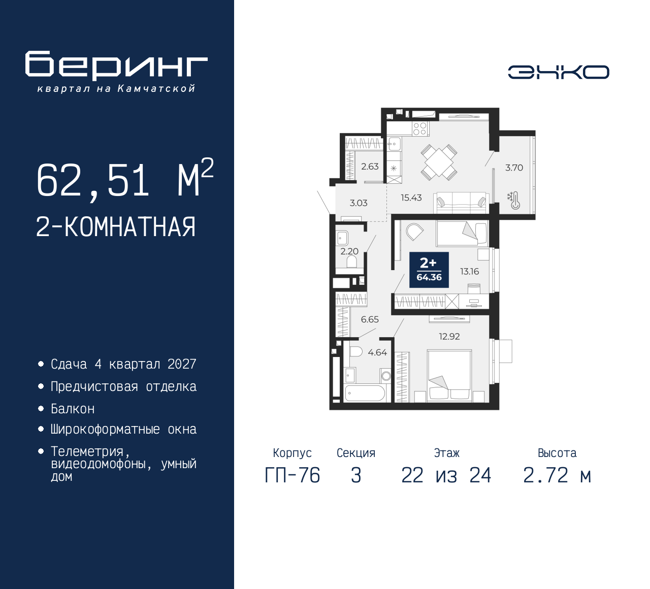 2-комн. квартира с предчистовой отделкой в ЖК "Беринг" на 22 этаже. Общая площадь: 62.51 кв.м., жилая: 26.08 кв.м., площадь просторной кухни-столовой: 15.43 кв.м. Комнаты изолированные, все окна выходят на одну сторону. В квартире один балкон, один совмещенный и один раздельный санузел. Высота потолков 2.72 м. Дом монолитный, черырехподъездный, переменной этажности, от 19 до 24 этажей. Квартира находится в 3-й секции высотой 24 этажа в корпусе ГП-76. На этаже 6 квартир. В подъезде 1 пассажирский и 1 грузовой лифт. Окончание строительства - 4 квартал 2027 года. Оформление сделки по договору долевого участия. Подобно знаменитому исследователю, мы чувствуем себя первооткрывателями этой локации. Хотим показать новую суть места, сформировать для вас жизненный опыт, которого ещё не было. Беринг — район зелёного цвета. Беринг — район, который откроется вам с другой стороны. Впечатлит новым уровнем комфорта и качеством жизни. Беринг — открытие на карте города. Первый квартал расположен в районе Тура, в границах улиц: Камчатская – Западносибирская – Энтузиастов. Вокруг уже есть всё для того, чтобы ежедневная рутина была лишь частью жизни и не доставляла дискомфорта. Школы и детские сады, магазины и аптеки, поликлиника, места для семейного отдыха, пеших и велопрогулок, и даже рыбалки. Масштабное озеленение дворов — визитная карточка ЭНКО и ваш оазис спокойствия, чтобы отвлечься от повседневности. Раскидистые деревья, кустарники, травы и цветы — осталось остановиться, вдохнуть и расслабиться, глядя на эту природную красоту. Стилистика подъездов продолжает концепцию Беринга, вдохновлённого Камчаткой: сдержанный, но при этом впечатляющий дизайн соседствует с удобством и функциональностью. (AQID02529305)